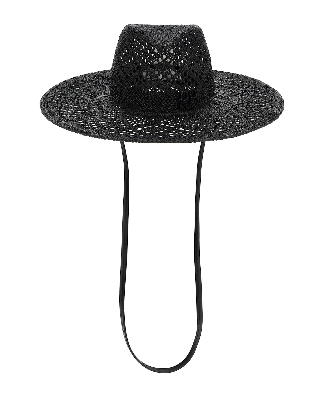 Embroidered leather-trimmed straw hat Black