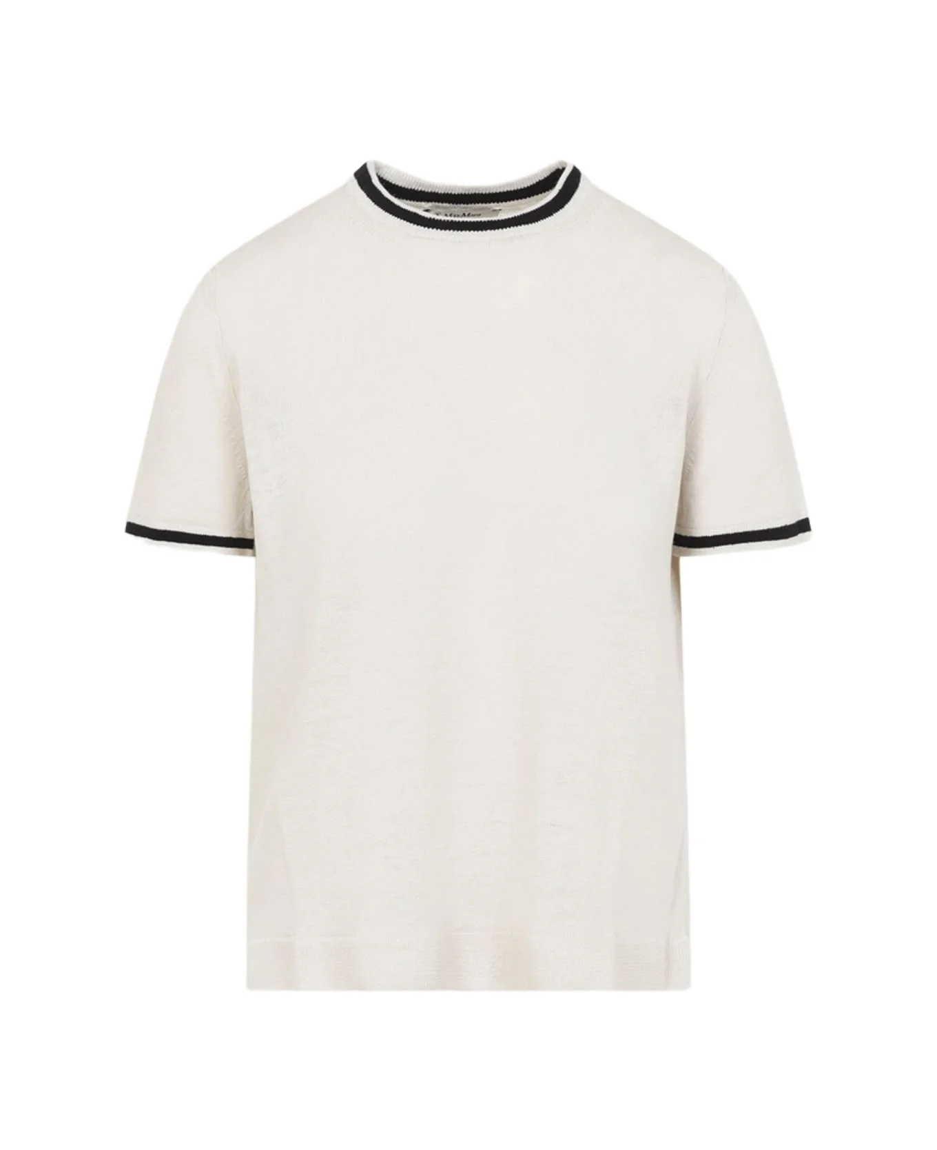 Max Mara`s Natural White Linen Nordica Striped Knit T-Shirt. Pure natural white linen t-shirt, round neck, short sleeves, straight hem, knitted design, contrasting black stripe details on the neck and on the edges. Made in: Italy Color: Naturale Model number: 2619361033600017