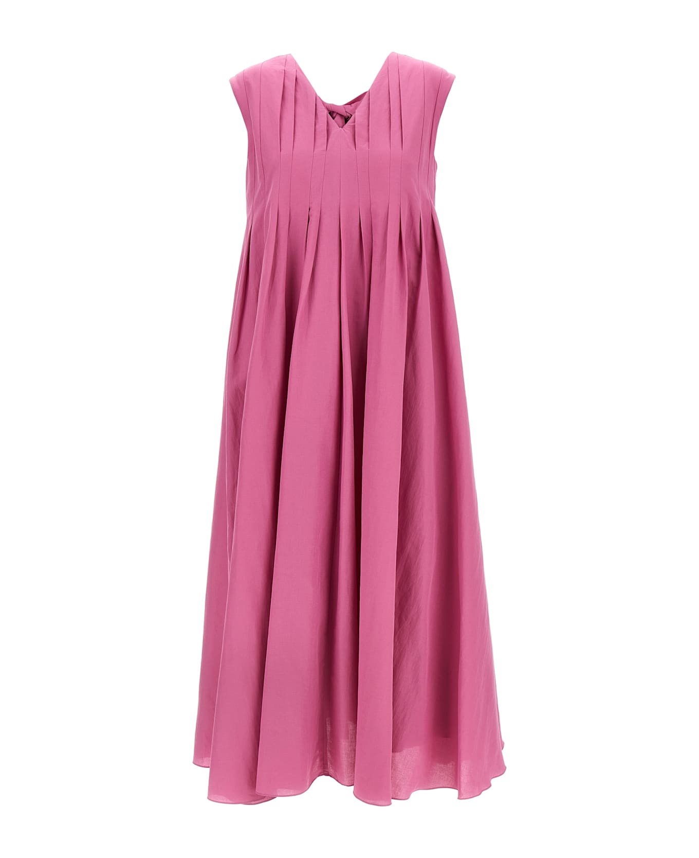 Long 'Piega' dress in cotton canvas and organzato ramie, flared silhouette with pleated pattern flat on the corset and at the waist, sleeveless, V-neck front and back, zip closure and ribbons to tie at the back. Composition: 70% ramie 30% cotton Made in: Romania Color: Pink Size and fit: - true to size fit Model number: 2519221023600004
