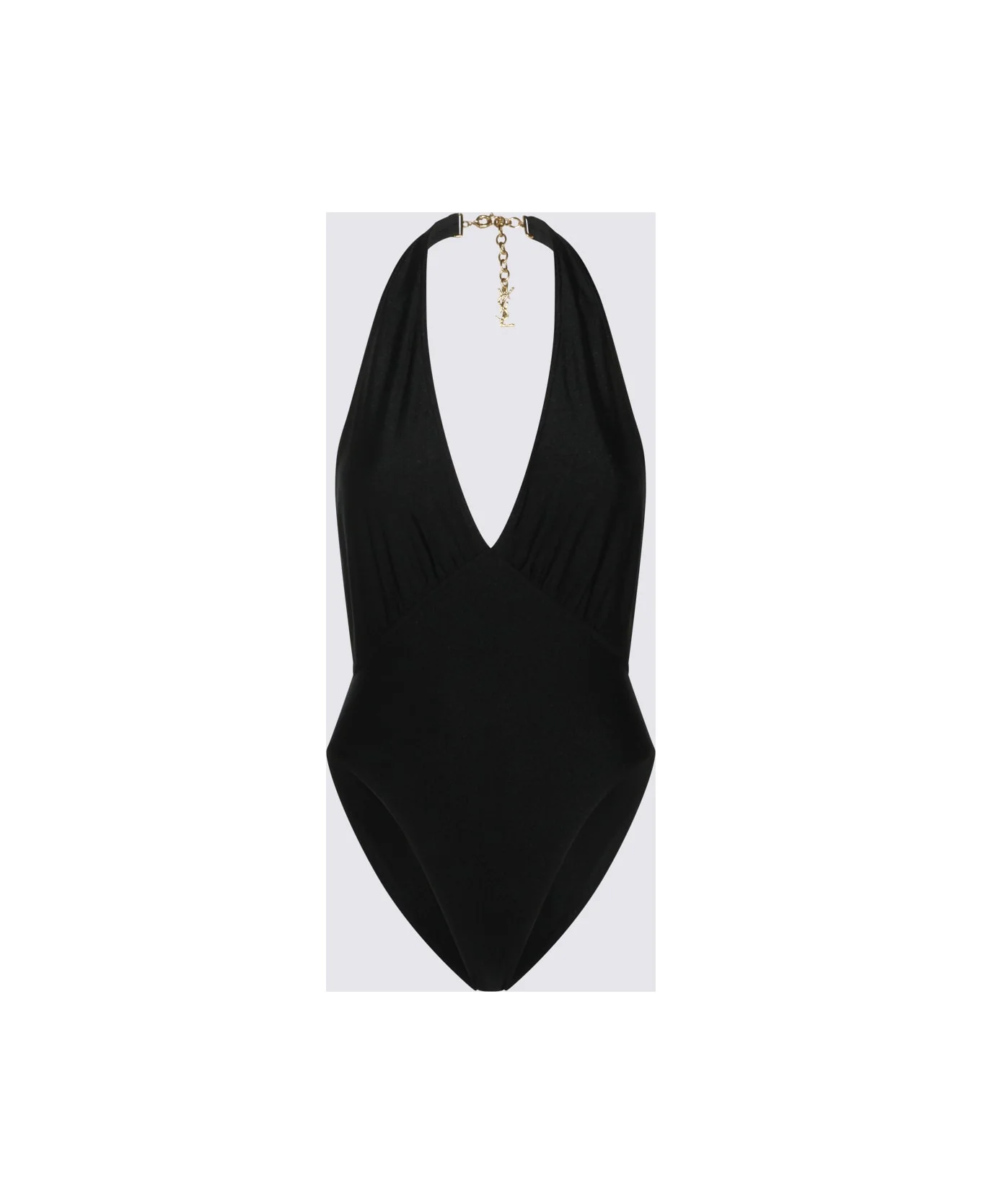 Black beachwear from Saint Laurent featuring v neckline, sleeveless, back fastening, gold tone hardware and elasticizated waist. Composition: _, 80% Polyamide, 20% Elastane Made in: Italy Color: Black Model number: 859623Y37WN1000