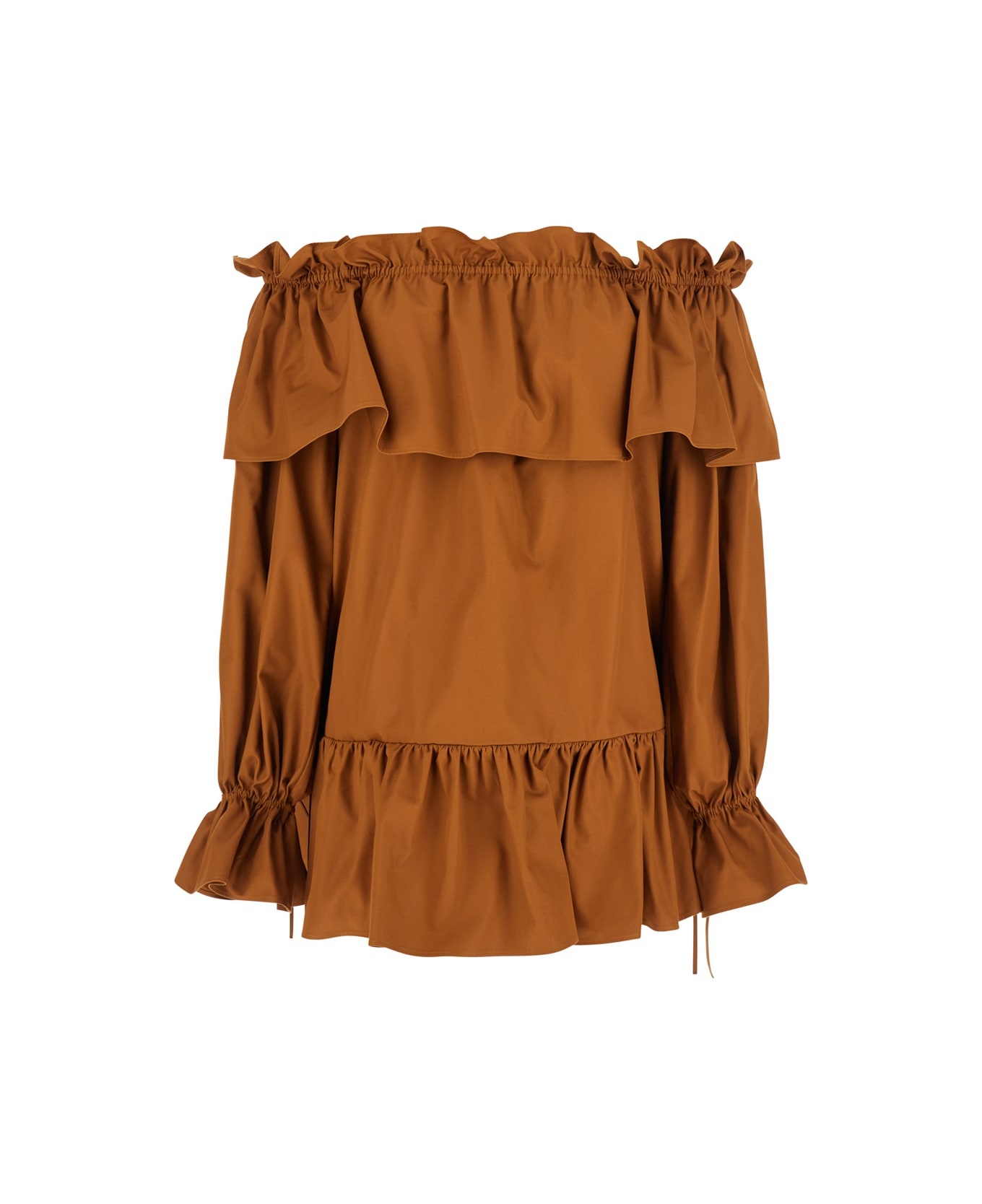 Off-the-shoulder ruffled cotton-twill mini dress Brick