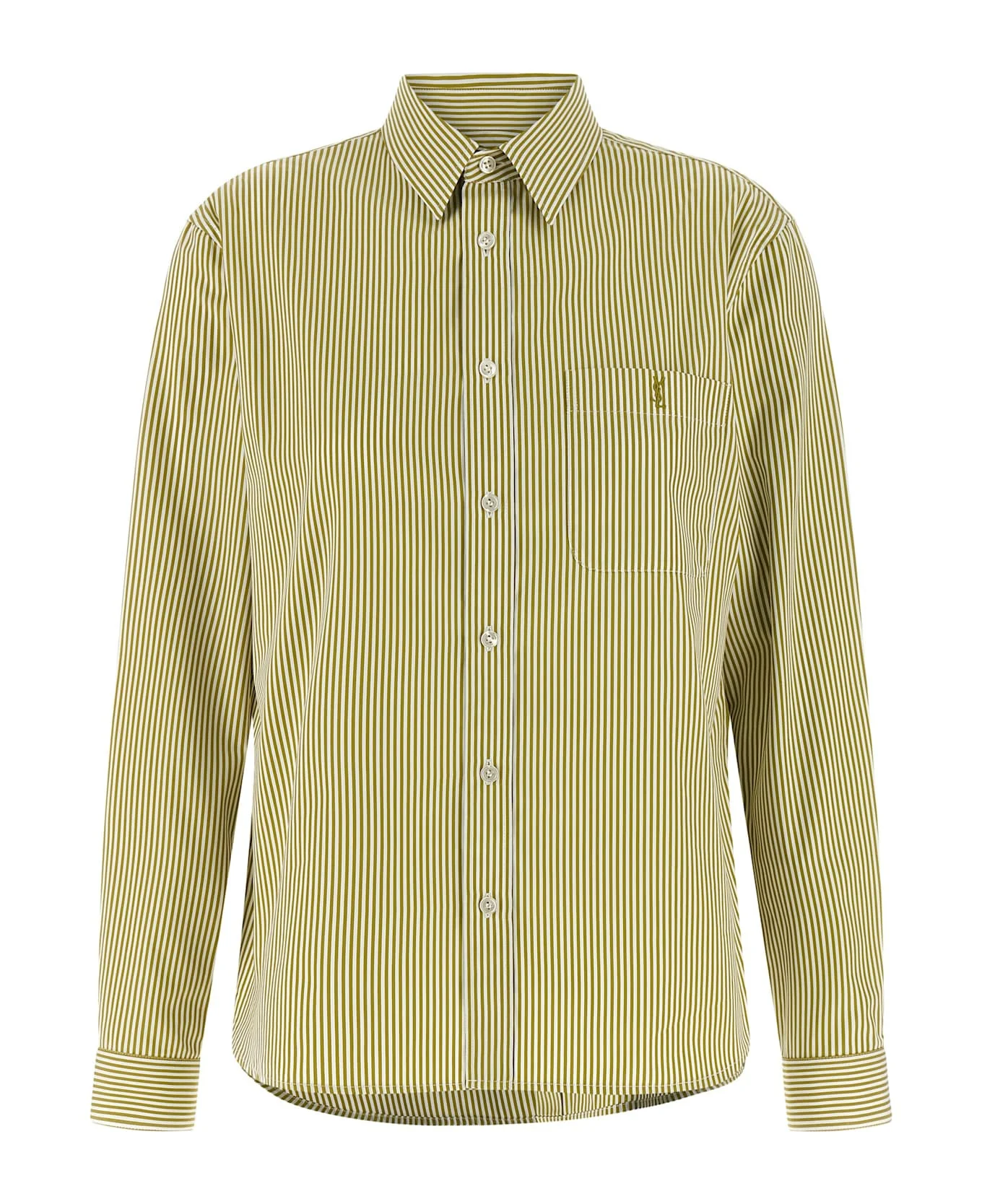 Striped cotton poplin shirt, pointed collar, breast pocket with 'Cassandre' lgoo embroidery, front mother-of-pearl button closure, long sleeves with one-button beveled cuffs, rounded hem. Composition: 100% cotton Made in: Italy Color: Green Size and fit: - true to size fit - FRENCH size Model number: 861080Y260D3302
