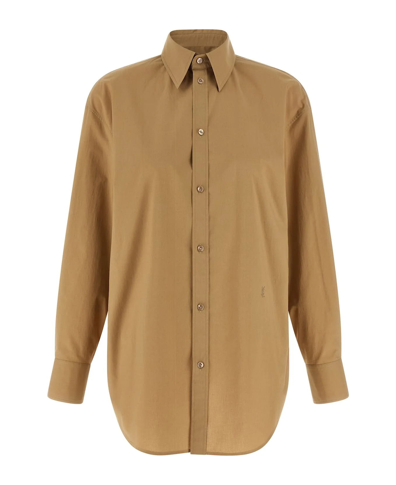 Cotton poplin shirt with tone-on-tone 'Cassandre' embroidered logo and mother-of-pearl button closure on the front, pointed collar, long sleeves with two-button blunt cuffs and dropped shoulders, rounded hem. Composition: 100% cotton Made in: Italy Color: Brown Size and fit: - comfort fit - FRENCH size Model number: 865483YZ9GB2100