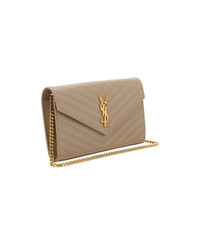 Leather monogram matellasse chain wallet by saint laurent, front closure with automatic button, slots card, four open pockets, one central zip pocket, embossed brand logo inside, golden brand logo on front, gold chain with leather handle. Composition: 100% % Calf Leather Bos Taurus Made in: Italy Color: Dark Beige Size and fit: - W 22 CM x H 14 CM x D 3 CM cm Model number: 377828BOW01