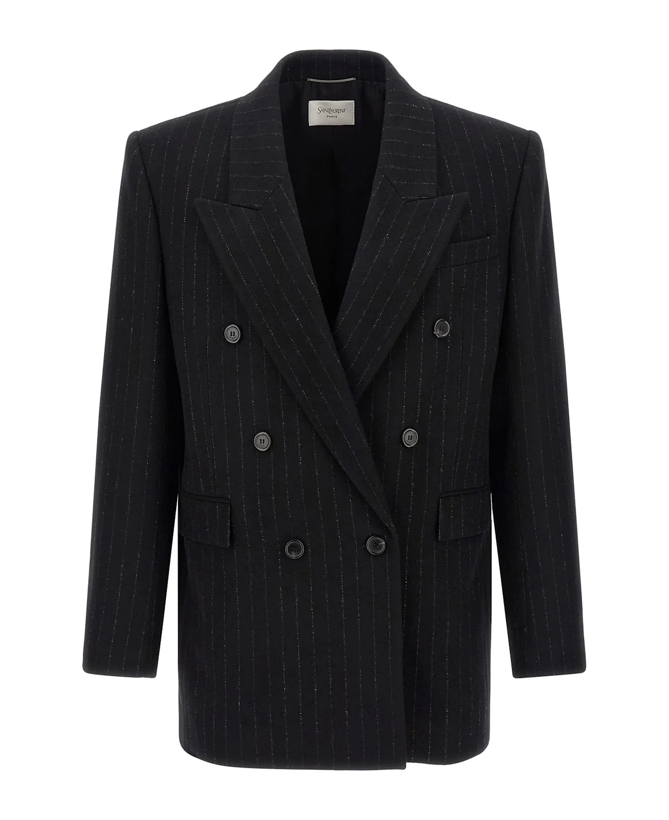 Double-breasted blazer in combed wool and cashmere flannel with pinstripe pattern, front button closure, peak lapels, breast pocket, flap pockets, two inside pockets, padded shoulder, cuffs with opening buttonholes, back slits, silk lining. Composition: 90% wool, 10% cashmere Made in: Italy Color: Black Size and fit: - Comfort fit Model number: 835102Y1M101095