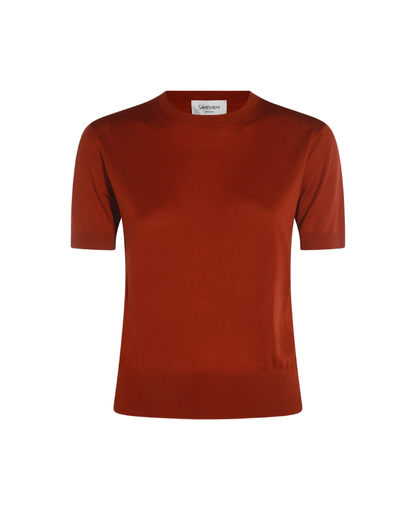 Red wool knitwear from Saint Laurent featuring round collar, short sleeves and soft vestibility. Composition: _, 100% Wool Made in: Italy Color: BRIQUE Model number: 841336Y76UO6160