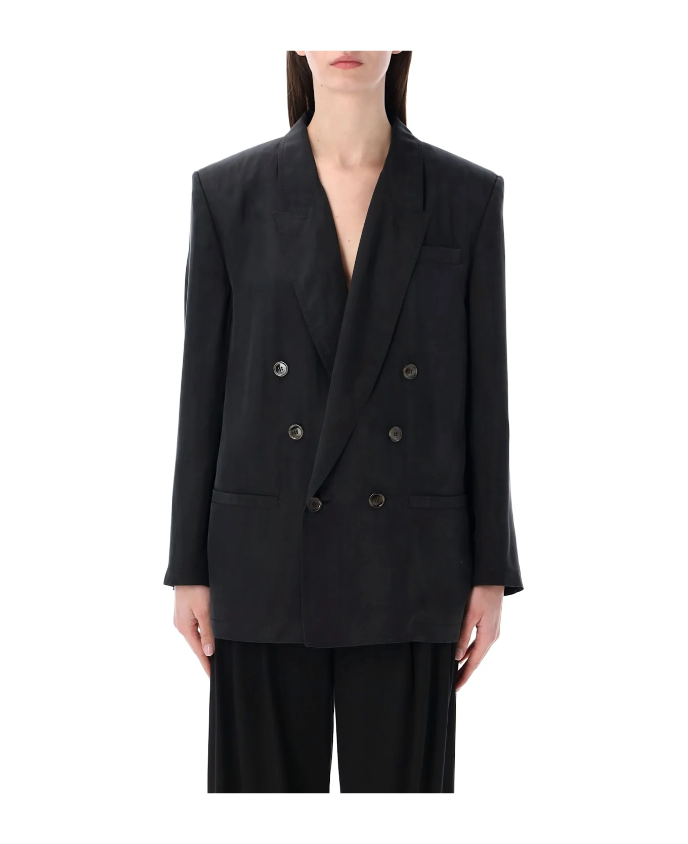 The Saint Laurent Double-breasted Silk Habotai Jacket Is A Sophisticated Take On Classic Tailoring. Featuring A Six-button Closure, Boxy Fit, And Peaked Lapels, It Exudes Timeless Elegance. Silk Habotai Double-breasted, Six-button Closure Boxy Fit With Padded Shoulders Peaked Lapels With Stitched Trim Two Front Welt Pockets, One Chest Welt Pocket Elegant, Structured Silhouette Alessandra Is 1,75 M And Wears Size 36 Composition: 100% silk Made in: Italy Color: BLACK Model number: 851026Y6J781000