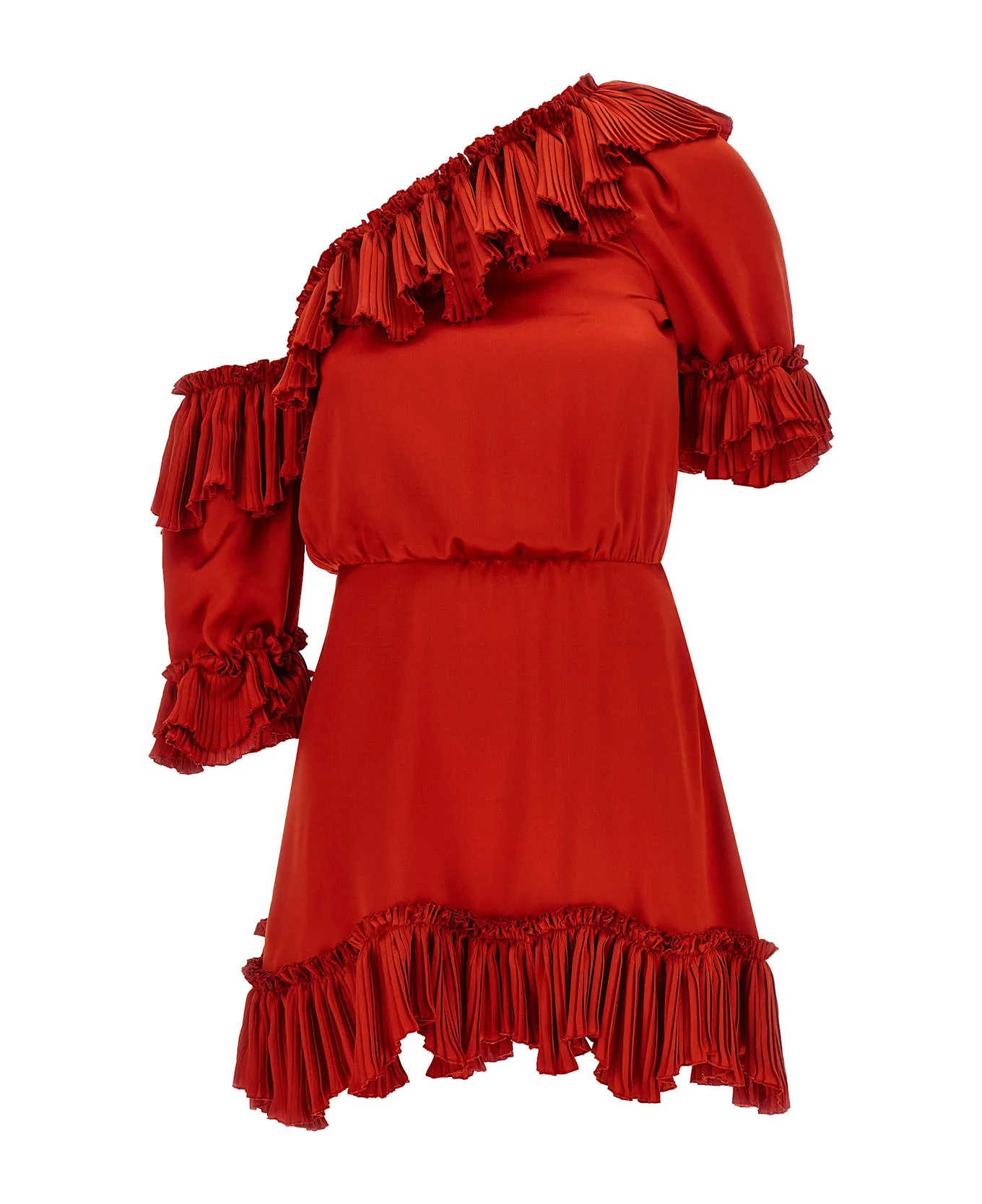 One-shoulder mini dress in shiny silk satin with short sleeves, pleated ruffles on the sleeves, neckline and hem, slightly curled waist, side closure with hidden zip, and asymmetric length. Composition: 100% silk Made in: Italy Color: Red Size and fit: - True to size fit Model number: 862002Y7G276850