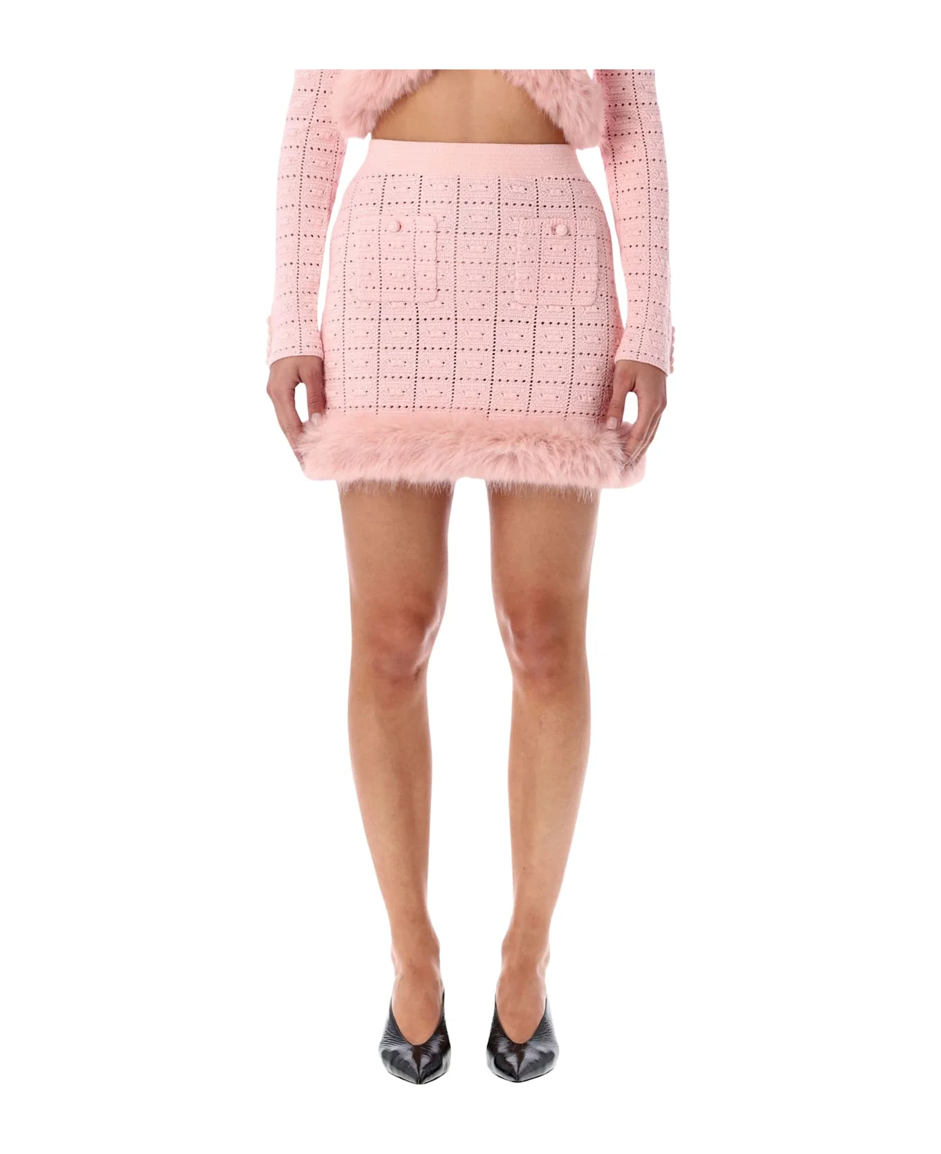 Playful Yet Refined, This Pink Pointelle-knit Mini Skirt By Self-portrait Exudes A Romantic Charm. Featuring An Elasticated Waistband And A Plush Faux Fur Hem, It Blends Comfort With Allure. Pair It With The Matching Cardigan For A Chic Coordinated Look Inspired By 90s Femininity. Stretch Pointelle-knit Fabric Faux Fur Hem In Matching Tone Elasticated High Waist Patch Pocket With Button Fitted Silhouette Alessandra Is 1,75 M And Wears Size S Composition: 82% cotton, 15% polyester, 3% cashmere Made in: China Color: PINK Model number: AW25120SKPPINK