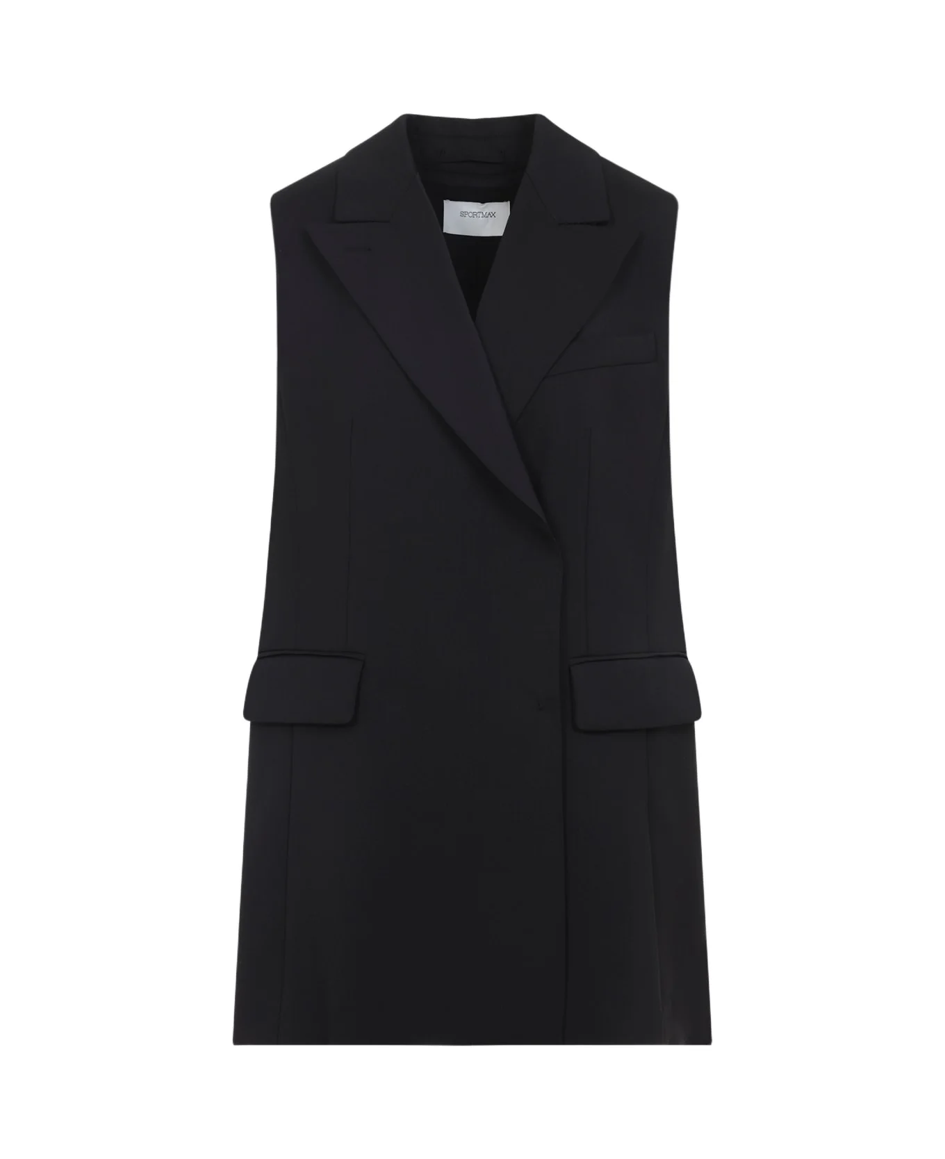 Sportmax Albero Black Virgin Wool Gilet. Crafted from black stretch virgin wool gabardine, featuring peak lapels, a double-breasted with concealed fastening, a welt pocket on the chest, two front flap pockets, a pleated insert at the back, a detachable metal belt on the back, a full lining, and a straight hem. Made in: Italy Color: Nero Model number: 2612281011600002