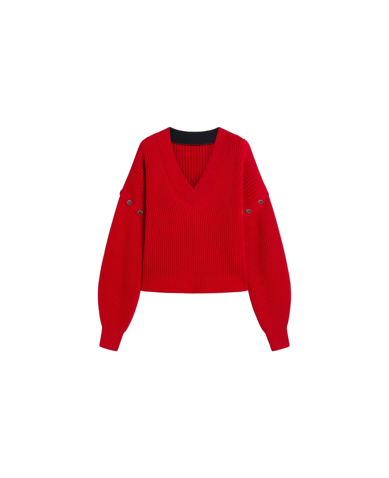 red V-neck ribbed knit balloon sleeves convertible sleeves Model number: TAY065