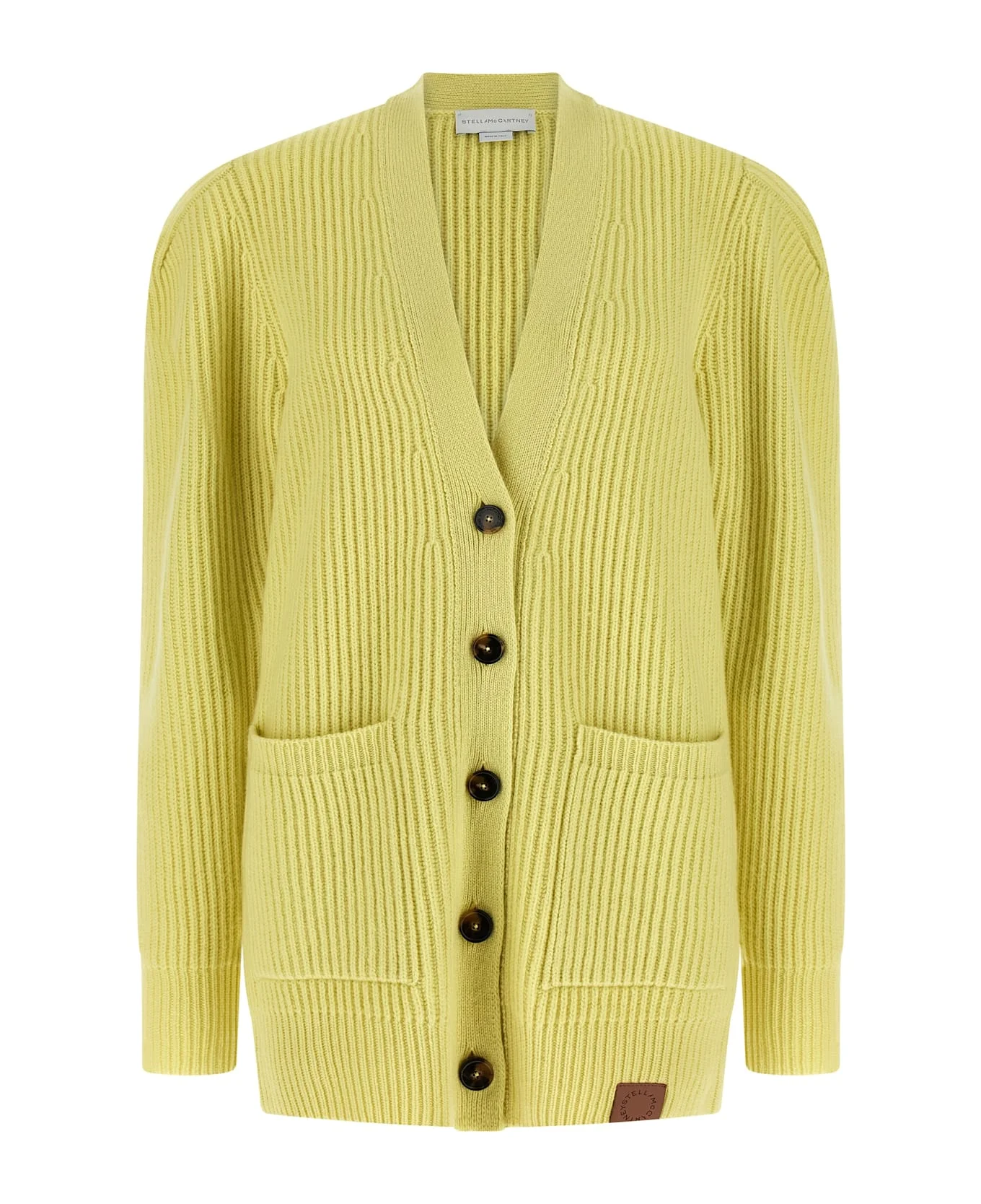 Wool cardigan, V-neck, boyfriend model, front button closure, front pockets, long sleeves with cuffs, front leather logo patch. Composition: 100% virgin wool Made in: Italy Color: Yellow Size and fit: - Comfort fit Model number: 6K11563S26327201