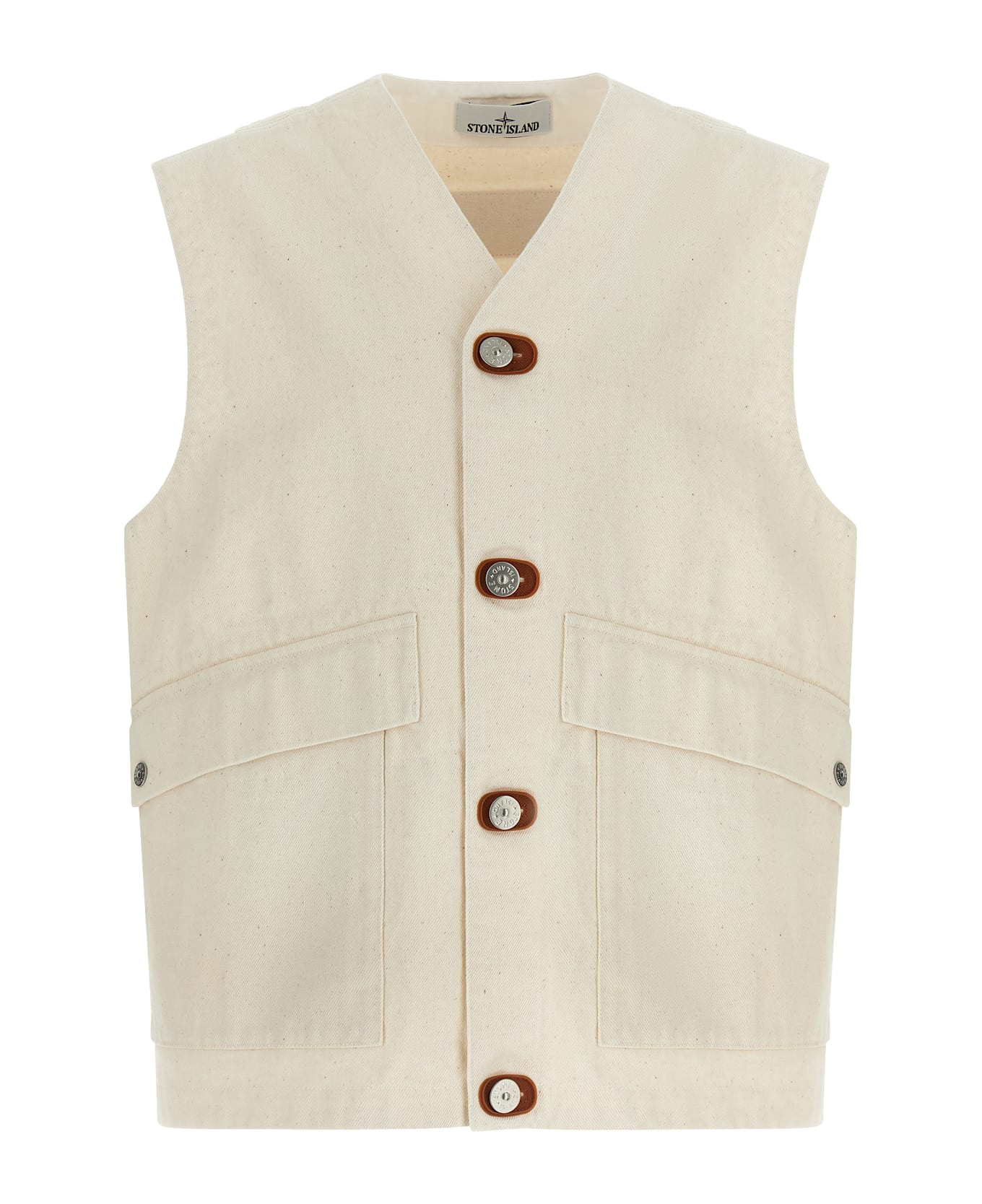 'G100012' vest in garment-washed cotton gabardine, V-neck, front button closure, pockets, back rubber logo patch. The unbleached fabric has some aesthetic impurities typical of raw cotton, which must be considered an integral and natural part of the material. SUSTAINABLE: This product is made with recycled cotton. Composition: 100% cotton Made in: Italy Color: Beige Size and fit: - true to size fit Model number: K2S15G100012S00T1V0093