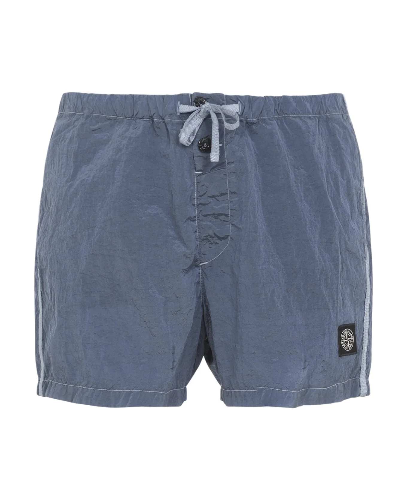 Stone Island Dark blue Polyamide Shorts. Dark blue tech fabric, elastic waistband and drawstring, front button fastening, side pockets, front logo patch detail, pocket on the back, straight hem. Made in: Indonesia Color: Dark Blue Model number: L1S15B100003S0043V0024