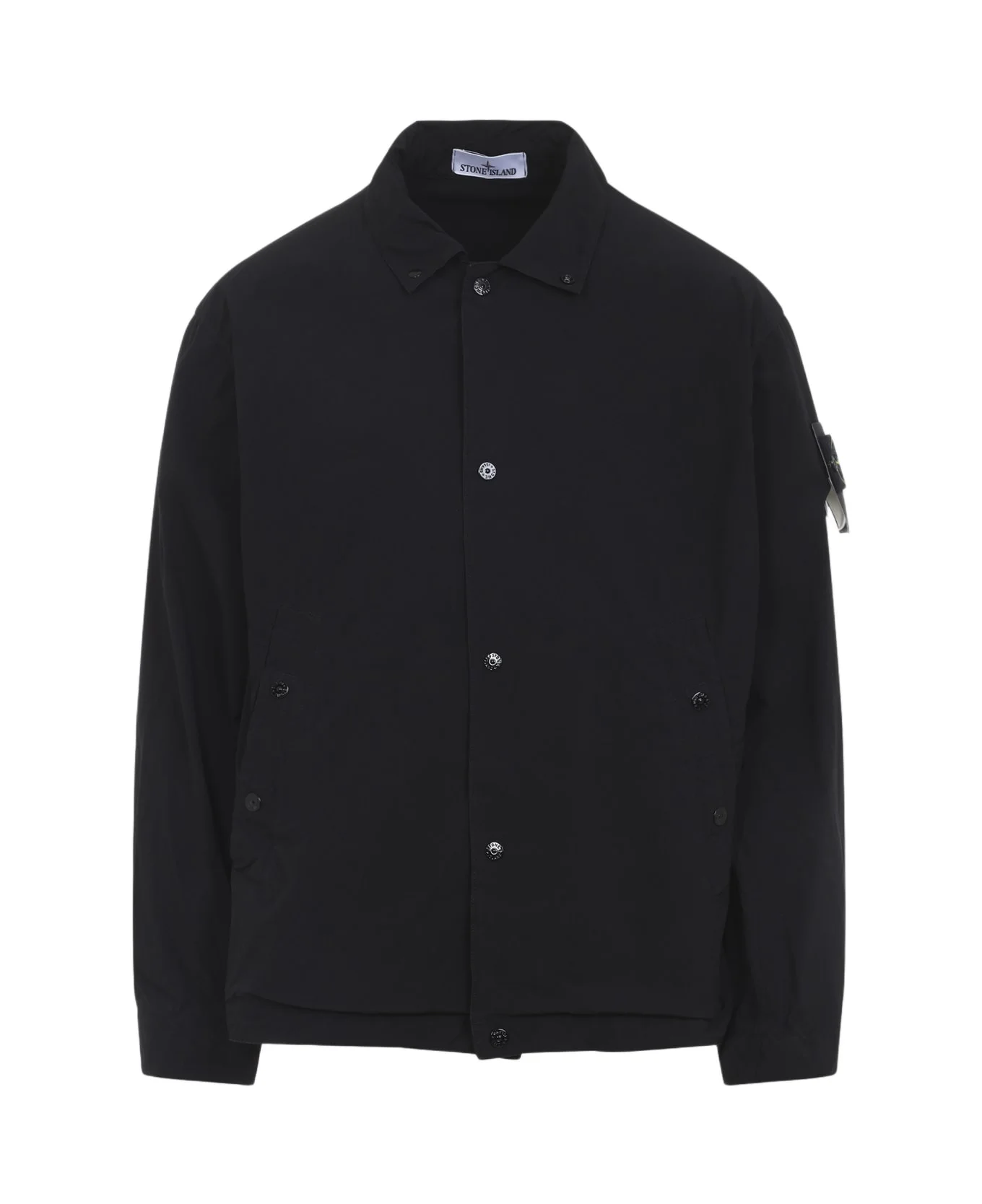 Stone Island Black Polyester Jacket. Crafted from black tech fabric, the jacket features a shirt inspired design, a button-down collar, front snap button fastening, the iconic logo patch on the left sleeve, fully lined. Made in: Vietnam Color: Black Model number: L1S154100041S0042V0029
