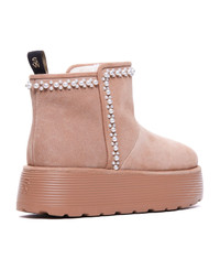 Stuart Weitzman beige Nellie Pearl Flatform booties, suede upper, round toe, pearls details Composition: 100% Suede And Rubber Sole Made in: Vietnam Color: Beige Size and fit: - Plateau 5 cm Model number: SK213NELLIE