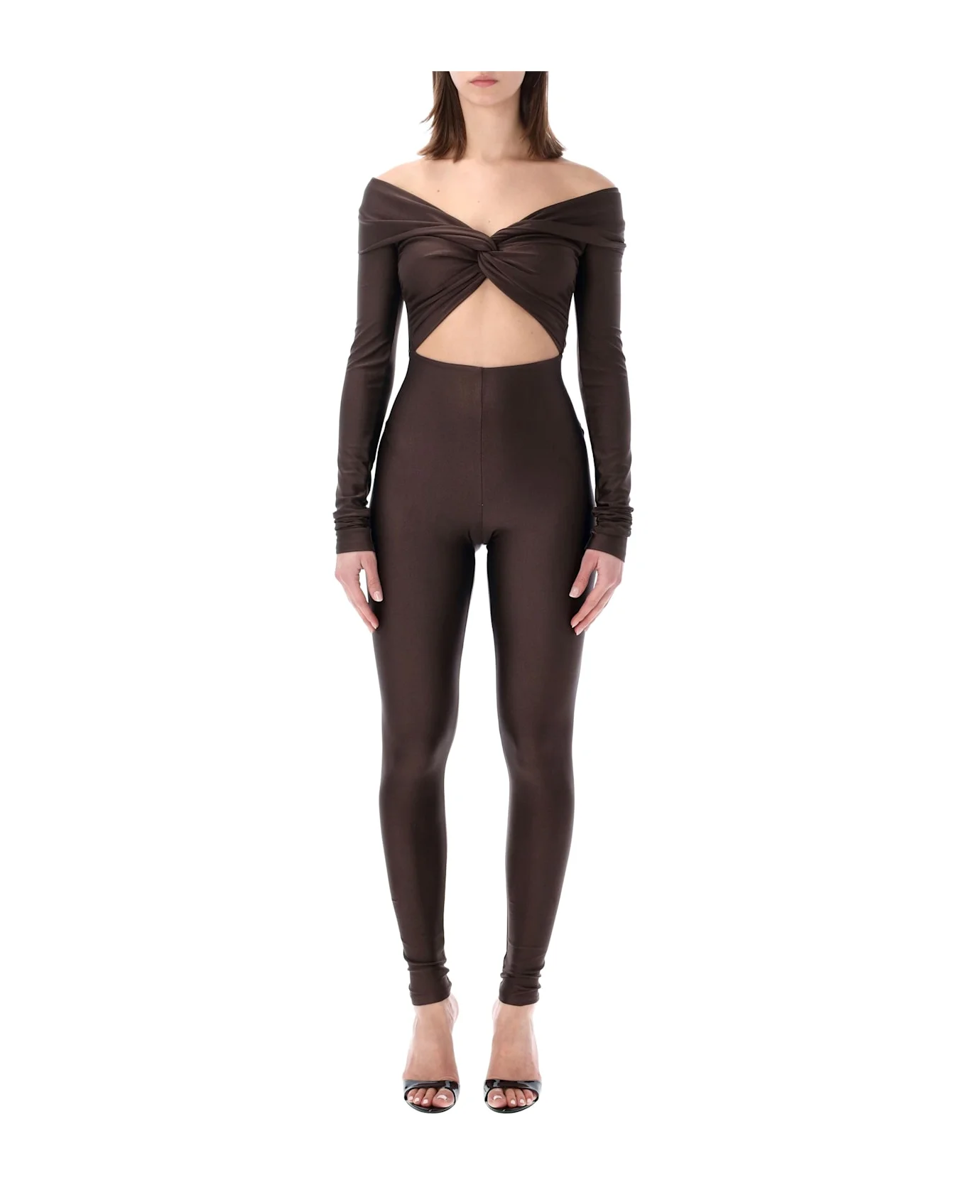 This Stretch Jumpsuit By The Andamane Features An Off-shoulder Neckline And A Sculpted Silhouette Enhanced By A Front Knot And Cut-out Detail. The Slim, Elongated Fit Creates A Sleek, Contemporary Look, Offering Both Comfort And Statement Appeal For Evening Or Elevated Styling. Soft Stretch Construction Off-shoulder Neckline Knot Detail At The Chest Front Cut-out Design Long Fitted Sleeves Skinny, Body-hugging Fit Model Is 1,72 M And Wears Size S Composition: 80% polyamide, 20% elastane Made in: Italy Color: DARK BROWN Model number: T190145ATJP062600