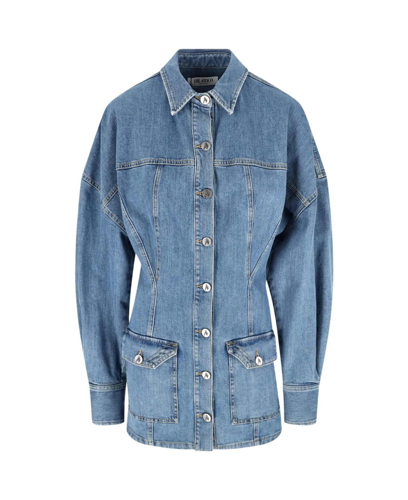 The Attico light blue denim mini dress with classic collar, button closure, long sleeves, two front flap button pockets, button cuffs, straight hem. Composition: 98% Cotton, 2% Elastane Made in: Italy Color: Light Blue Size and fit: - Vestibilita regolare Model number: 260WCA00482DDS001AA024