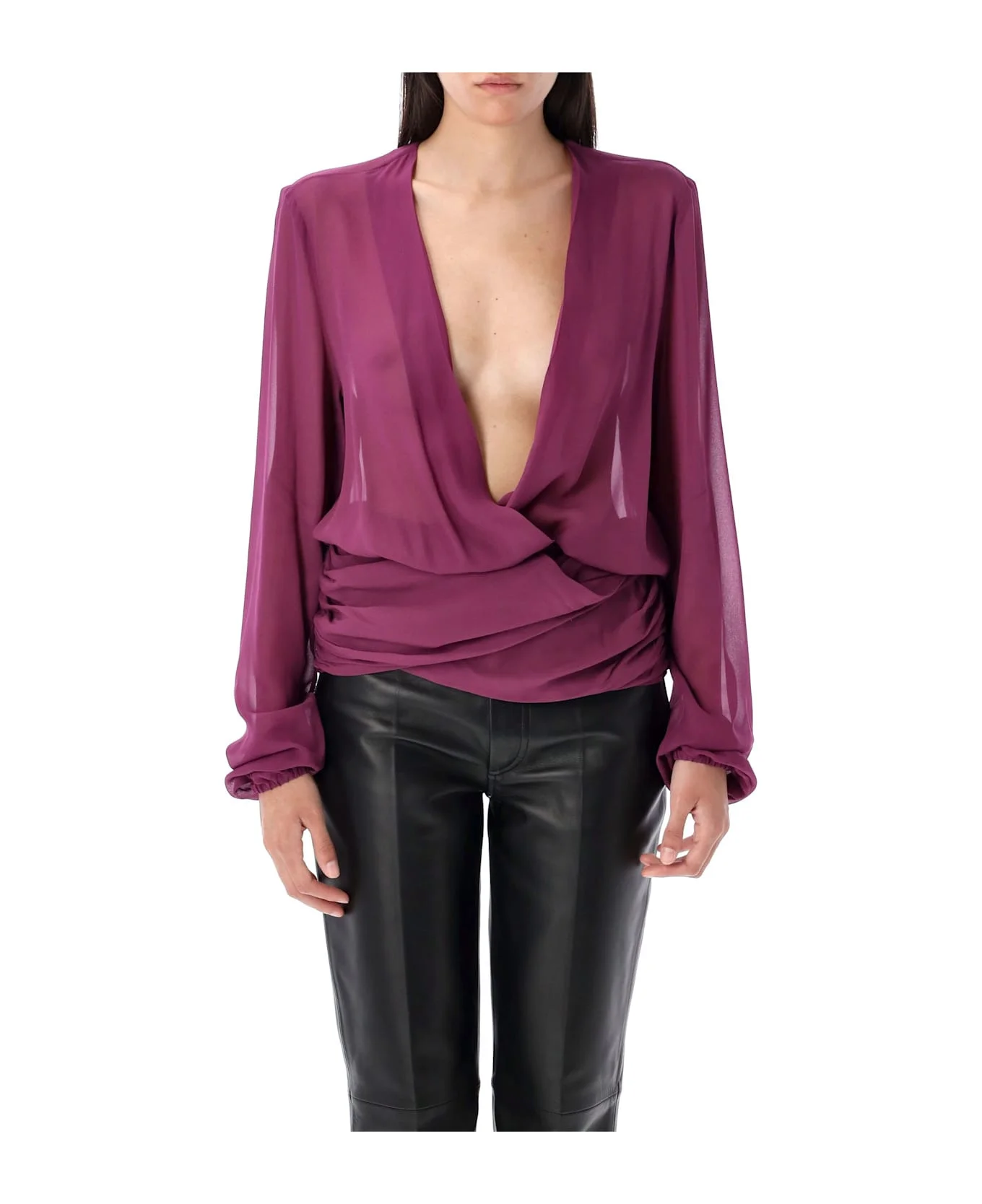 Georgette Blouse By The Attico. Featuring: Deep V-neckline Wrap Design Long Sleeves Elastic Cuffs Ties Fastening Embroidered Logo Label At Back Loose Fit Model Is 1,70 M And Wears Size 40 Composition: 100% viscose Made in: Italy Color: PLUM Model number: WCE00003VVV099AA851
