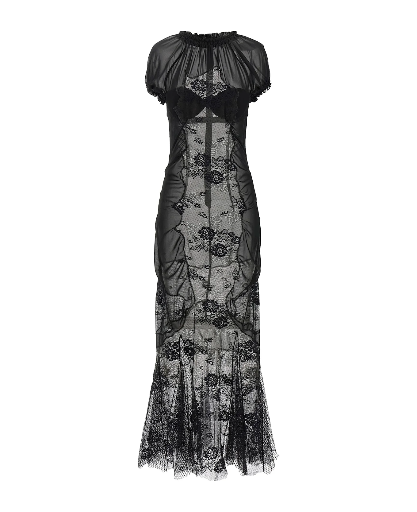 Tulle midi dress with tone-on-tone lace inserts I don't see, elastic high neck with ruffles, integrated bandeau bra with back hook closure, short raglan sleeves with elastic cuffs and ruffles, flared flounce with raw cut hem on the hem. Composition: 52% cotton, 48% polyamide Made in: Italy Color: Black Size and fit: - true to size fit Model number: 260WCW00286100