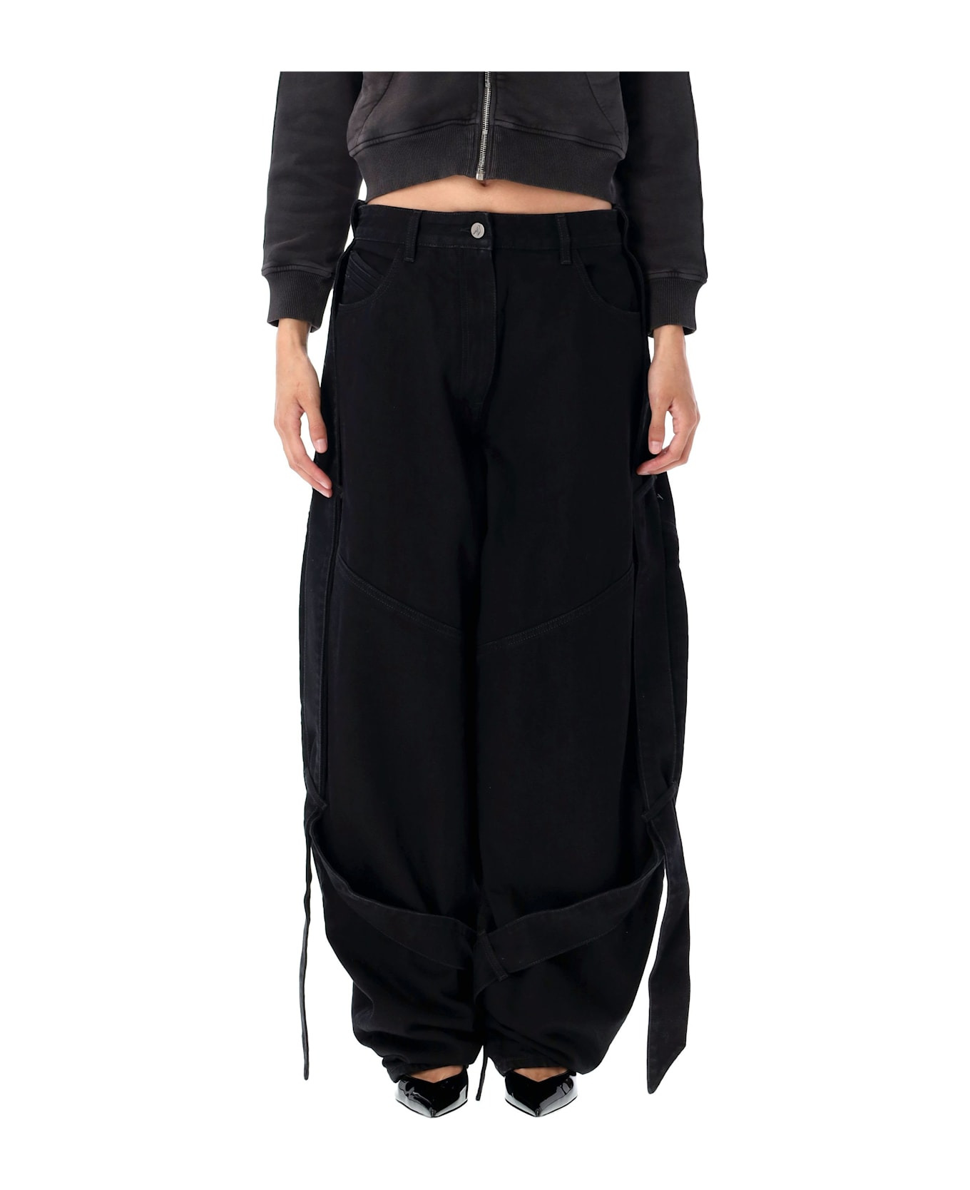 Long Cotton Denim Pants By The Attico. Featuring: Button And Zip Fly Belt Loops Five Pockets String Details Wide Leg Relaxed Fit Model Is 1,70 M And Wears Size 26 Composition: 100% cotton Lining, 65% polyester, 35% cotton Made in: Italy Color: BLACK Model number: WCP00279CCC120AA100