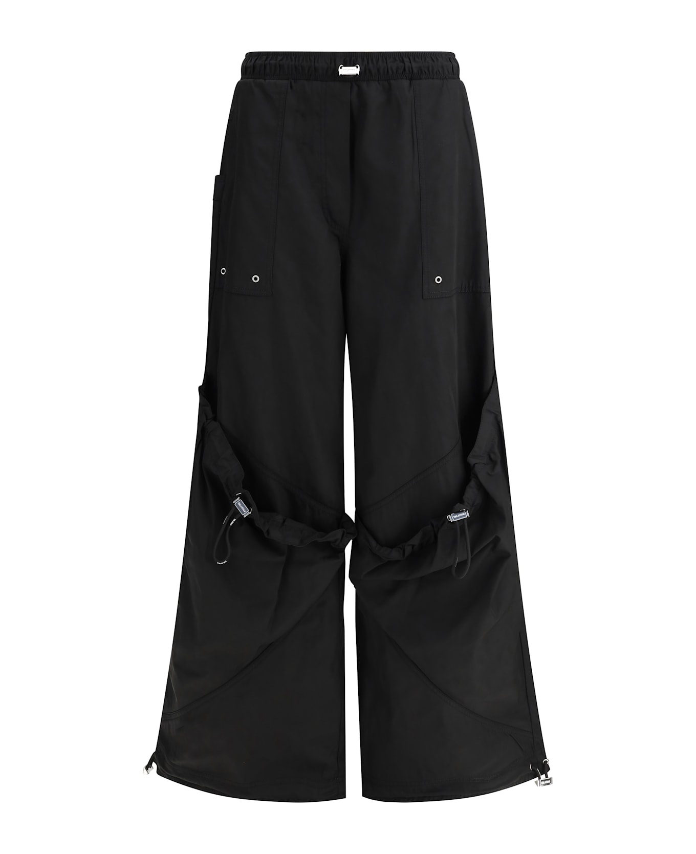 Nylon cargo pants by the attico combine urban style and functionality. they feature an adjustable drawstring elastic waistband for comfort and a customizable fit. the two side welt pockets and two front pouch pockets, also adjustable with drawstrings, offer practicality without sacrificing aesthetics. the two patch pockets on the back add additional space for essentials. the wide-leg style gives a relaxed, modern look, perfect for a casual-chic look, combining elegance and functionality. Composition: 100% % Polyester Made in: Italy Model number: 250WCP00255PLL001AA100