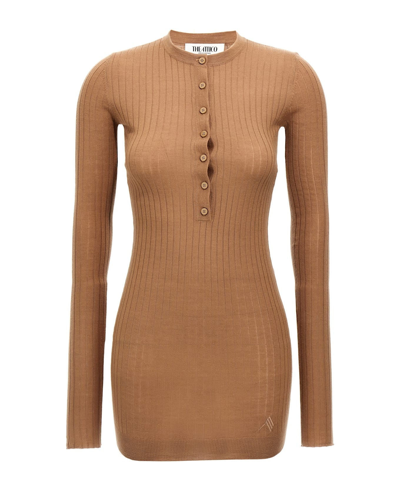 Cashmere and ribbed silk knit mini dress, tone-on-tone logo embroidery on the front, crew neck, front buttons, long sleeves. Composition: 70% cachemire 30% silk Made in: Romania Color: Brown Size and fit: - true to size fit Model number: 250WCA00348046