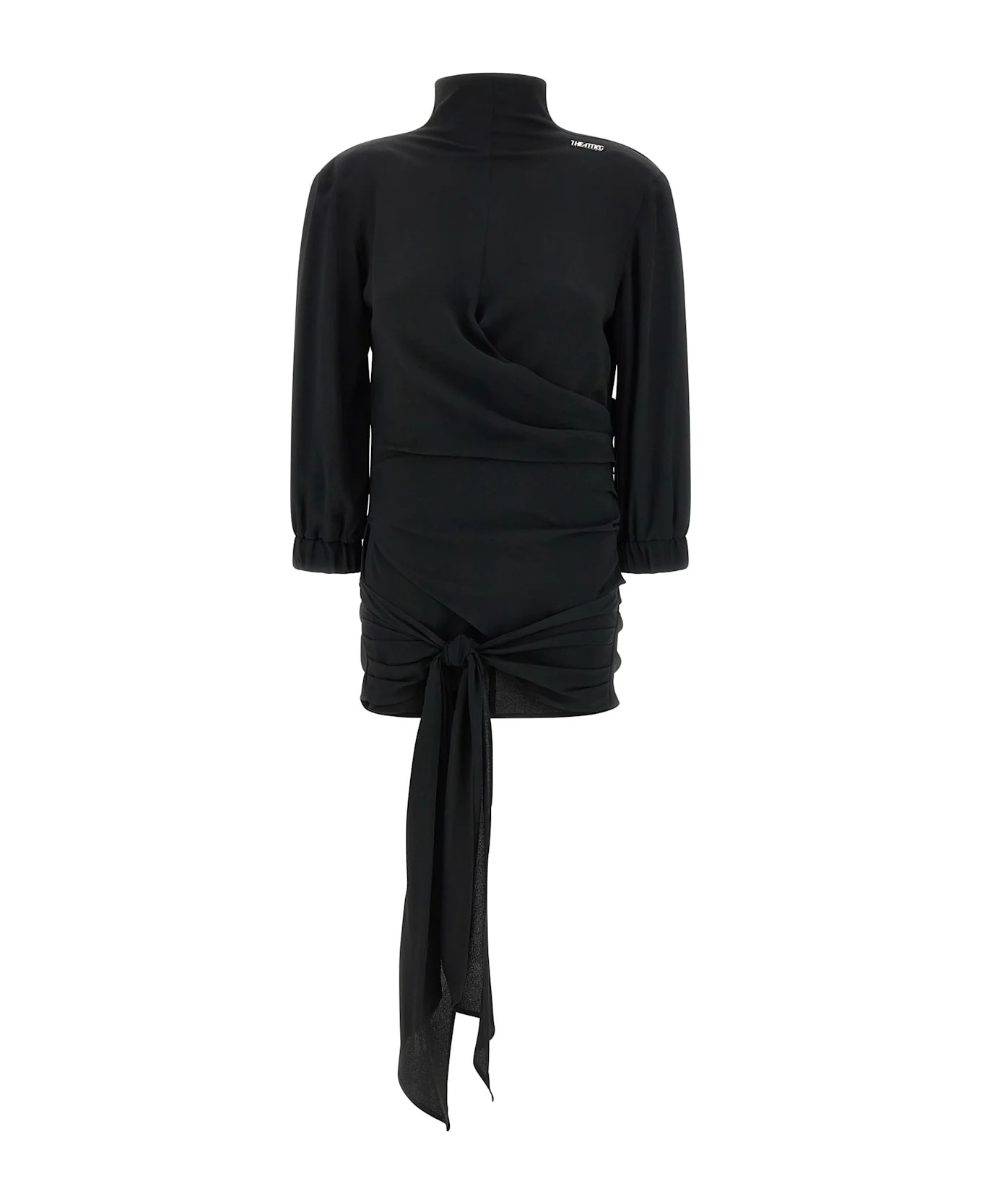Silk blend crepe top, metal lettering logo and front drape, high neck, 3/4 sleeves with elastic cuffs, back zip closure, sash at the waist to tie as desired. Composition: 63% acetate, 37% silk Made in: Italy Color: Black Size and fit: - true to size fit Model number: 260WCI00030100