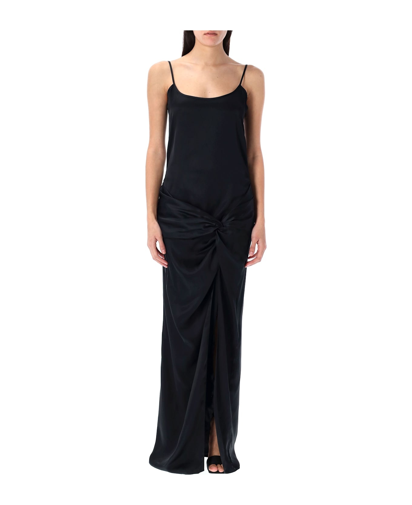 Satin Long Dress By The Attico. Featuring: Adjustable Thin Straps Hidden Side Zip Fastening Draped Knot On The Front Model Is 1,70 M And Wears Size 40 Composition: 100% viscose Made in: Italy Color: BLACK Model number: 250WCW00184VVV088100