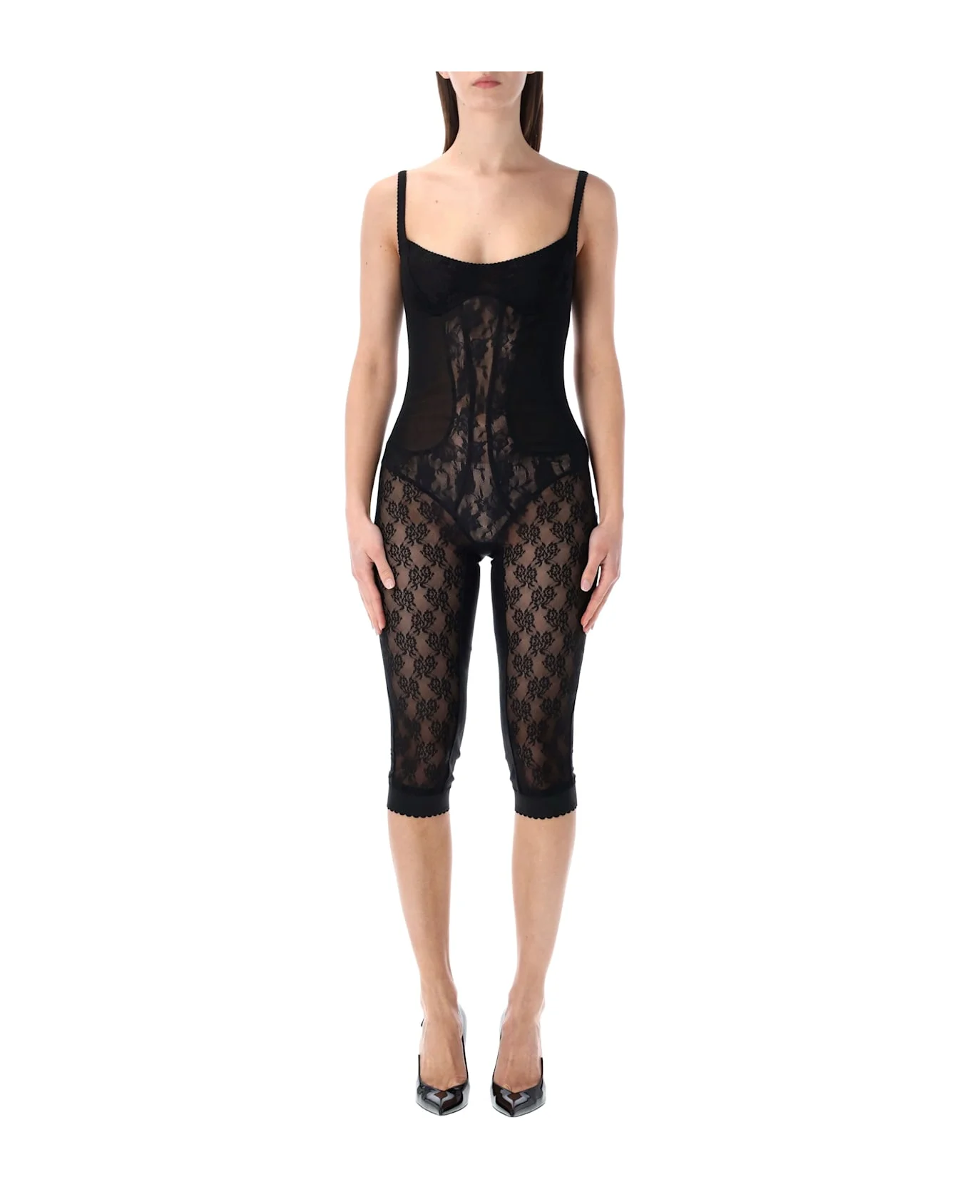 The Attico Black Lace Overall Features A Sculpting Mix Of Tulle And Lace For A Flattering, Body-conscious Fit. With Adjustable Shoulder Straps, A Semi-sheer Design, And Intricate Floral Lace Detailing, This Piece Exudes Sophisticated Allure. Perfect For Evening Wear Or Special Occasions, It Highlights Elegance And Feminine Contours While Maintaining Comfort And A Modern Edge. Overall In Sculpting Tulle And Lace Adjustable Shoulder Straps Semi-sheer Design With Floral Lace Body-conscious Fit Cropped Legs Ending Below The Calf Alessandra Is 1,75 M And Wears Size 42 Composition: 75% polyamide, 25% elastane Made in: Italy Color: BLACK Model number: WCO00020MIX082AA100