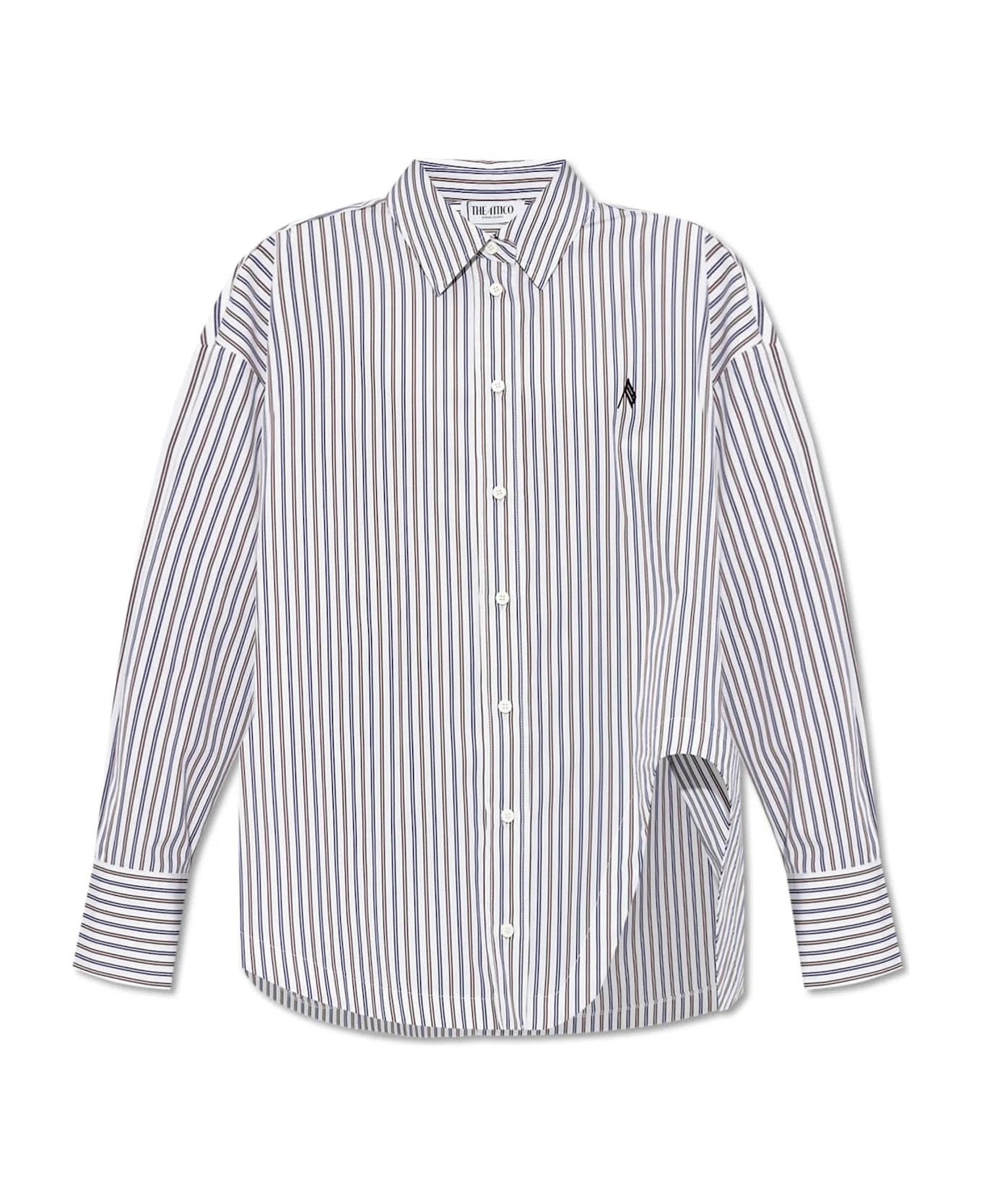 Exude sophistication with this Striped Pattern Shirt by The Attico, a refined statement piece designed for the discerning woman. Meticulously crafted from pristine, lightweight cotton, this shirt epitomizes elegance with its oversized silhouette, elongated back hem, and classically tailored collar. The strikingly vertical stripes delicate shades of blue, brown, and white deliver a sense of heightened length and modern allure, beautifully accentuating the shirt's crisp structure. Wide cuffs grace the long sleeves, while a subtle, embroidered designer logo on the left chest showcases understated exclusivity. Button fastenings accentuate the sleek front, enhancing its versatile charm ideal for layering or as a standalone feature. This singular creation perfectly balances soft femininity with bold lines, mirroring The Attico's celebrated aesthetic. Why choose this product? Luxurious, breathable cotton fabric for enduring comfort Distinctive oversized design with impactful vertical stripes Signature designer embroidery for a mark of exclusivity Versatile styling, suitable for elevated day-to-evening ensembles Composition: 100% Cotton 100% Cotton 100% Cotton Made in: European Union Color: White/black Model number: 251WCH00004CCC117AA