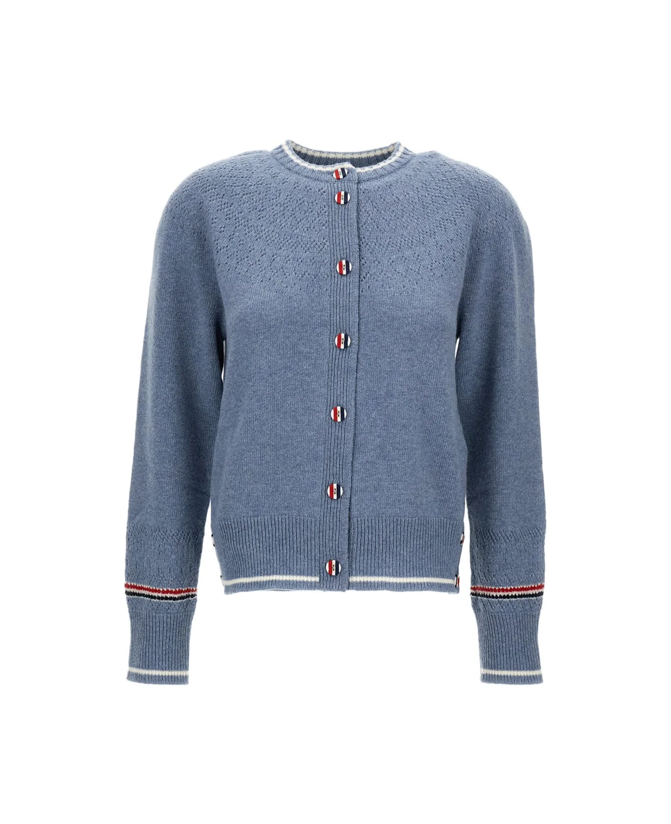 Crew neck cardigan made from premium merino wool Front closure with fabric-covered buttons Cuffs with fabric-covered buttons Elegant and refined Fair Isle pointelle pattern Iconic knitted detail with Thom Browne s distinctive RWB (red, white, blue) stripe Slim fit Perfect for formal and casual chic looks Color: Light blue Composition: 100% Virgin Wool Made in: Italy Color: Clear Blue Model number: FKC676AY1029440