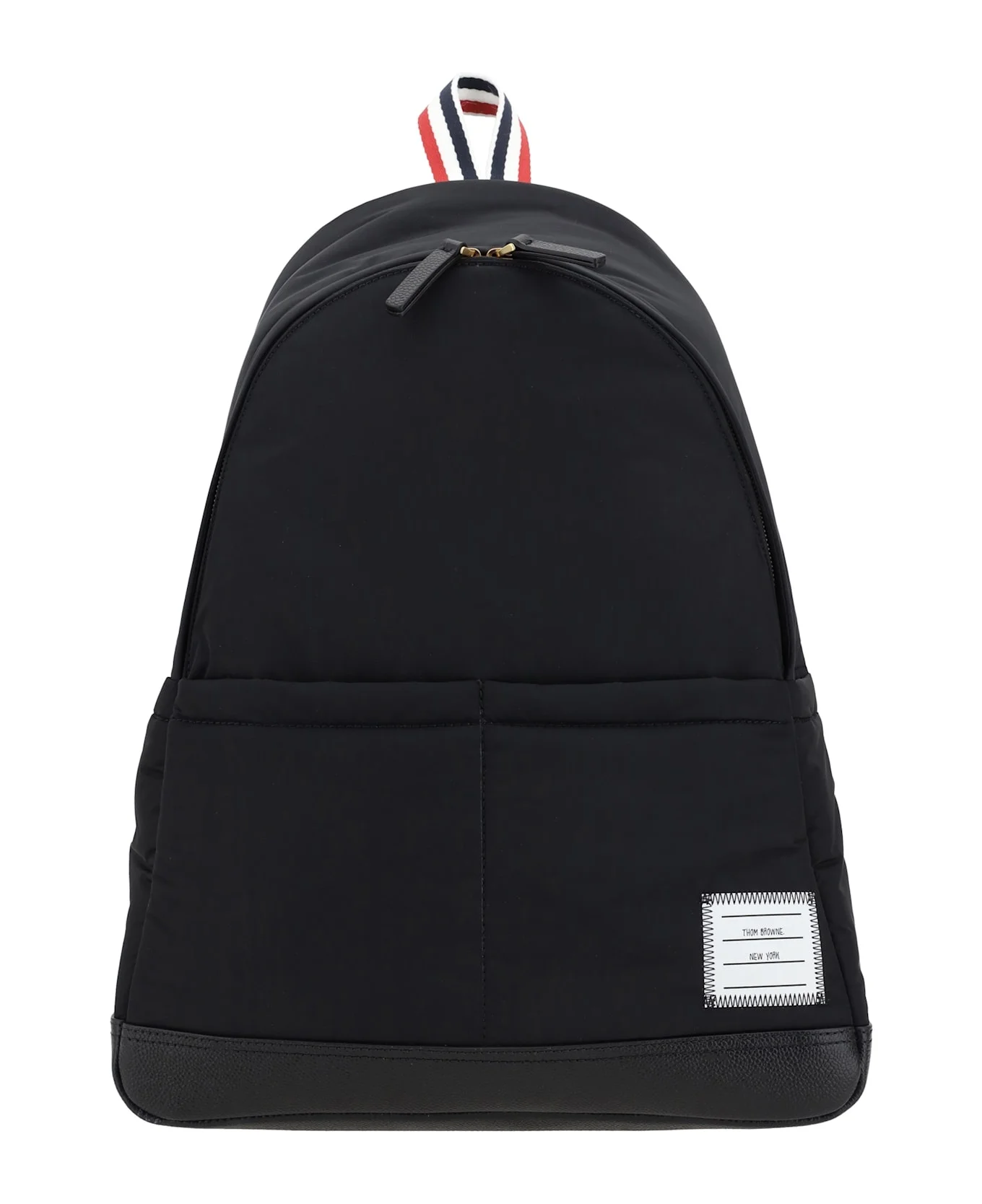 Thom browne's backpack features a double-slider zipper closure for easy access. adjustable, padded shoulder straps provide comfort, while the top handle offers a second carrying option. two side welt pockets and a front patch pocket provide ample space for essentials. the brand's iconic monogram patch applied to the front and the inner lining with the brand's classic colored bands add a distinctive touch. inside, the backpack features a single compartment, combining practicality and style. Composition: 100% % Polyester Made in: Italy Color: Black Model number: UAG210A07259001