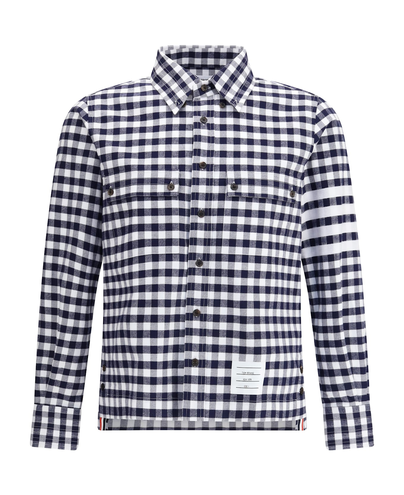 Thom browne's vichy cotton flannel shirt combines tradition and character in a unique design. featuring a classic collar and front button closure, it is distinguished by the iconic patch on the front that underscores its distinctive identity. the asymmetric hem adds a contemporary touch, making this garment perfect for those who love a sophisticated yet original style. Composition: 100% % Cotton Made in: Italy Model number: MWL417AF0945415