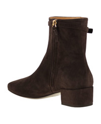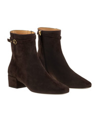 Soft suede ankle boot. Featuring an ankle strap with button and Tod's monogram, it has a leather sole, covered heel and zip on the inside. - Made in Italy - Women's leather ankle boots - Suede goatskin upper - Strap and button with Tod's monogram - Zip fastening on the inside - Leather lining and insole - Leather sole - Care and maintenance instructions included - Tod's logo pouch DESIGNER ID: XXW33L0JN60HR0S808 Composition: Upper: Suede calfskin leather Lining: Leather Sole: Rubber Made in: Italy Color: Palissandro Size and fit: - Heel height: 4.5 cm Model number: XXW33L0JN60HR0S808