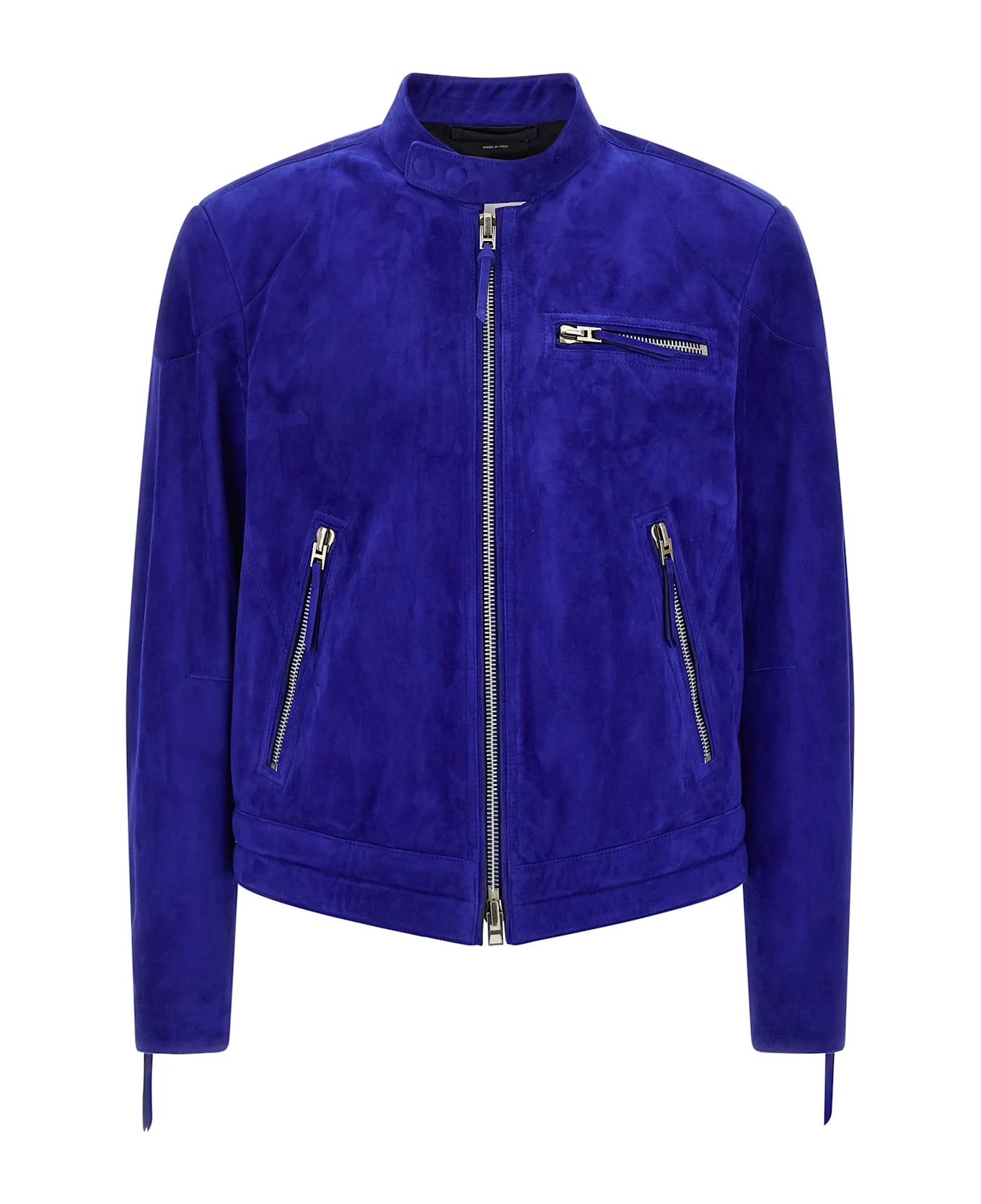 Suede cashmere jacket with slightly padded details, biker style, high neck with snap button closure, front zip closure, pockets, long sleeves with zip on the cuffs, lining. Composition: 100% calfskin leather (Bos Taurus) Made in: Italy Color: Blue Size and fit: - true to size fit Model number: LXI016LMS028UDC