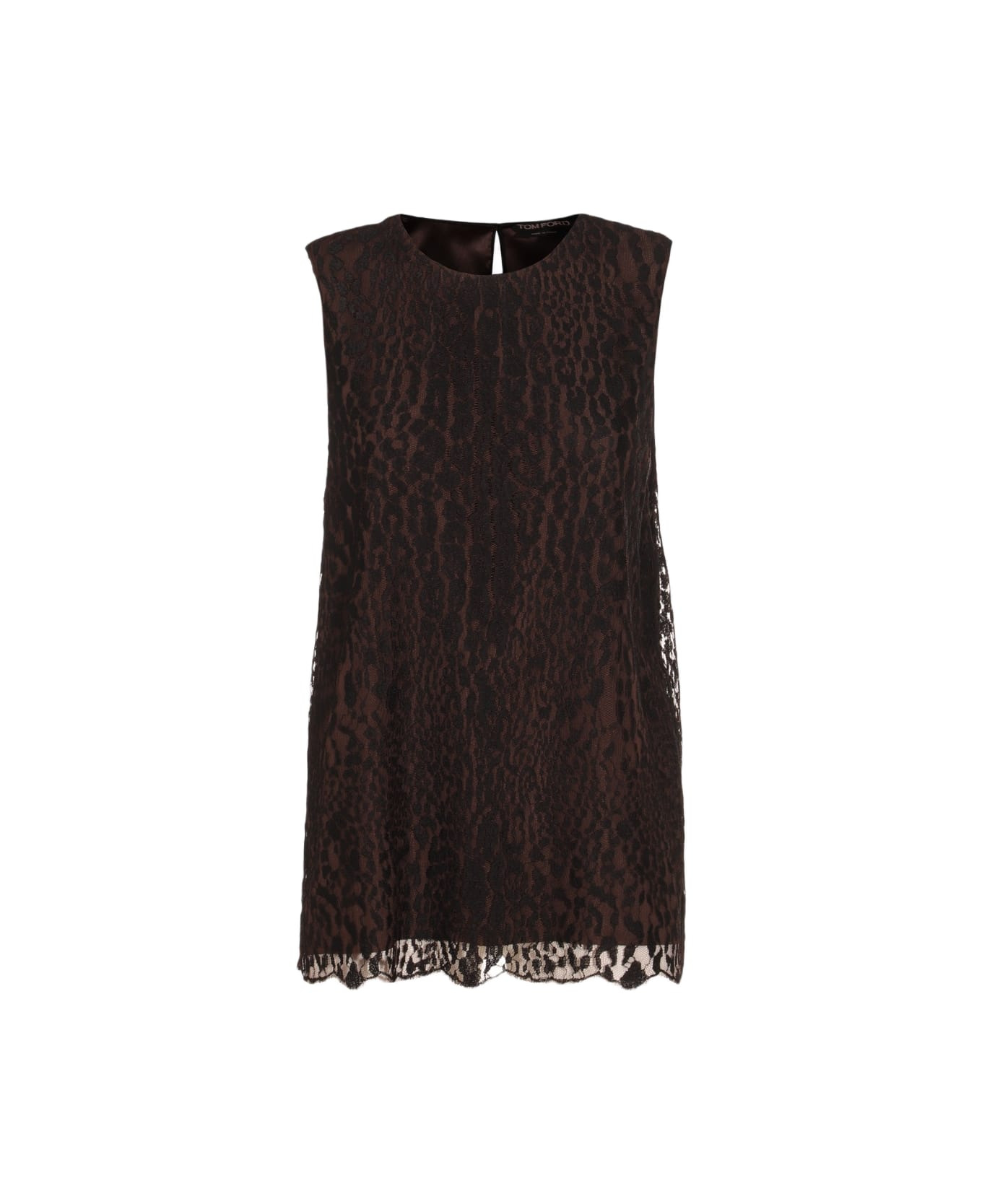 Black and brown top from Tom Ford featuring round collar, sleeveless, rear button fastening, lace details and regular vestibility. Composition: _, 81% Viscose, 19% Polyamide Made in: Italy Color: BLACK/CHOCOLATE Model number: TS2117FAX1546XBLCH