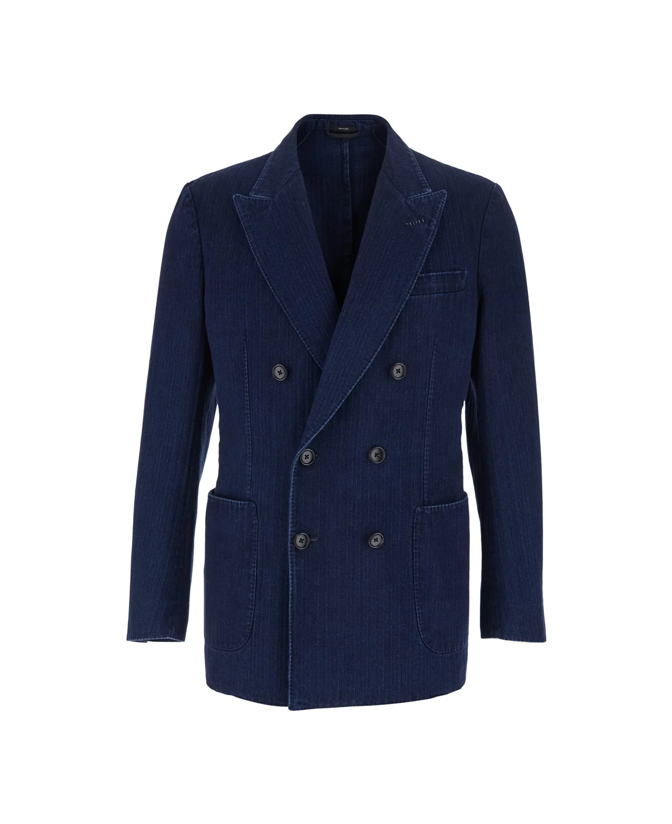 Blue Double-breasted Jacket With Peak Revers In Cotton Man