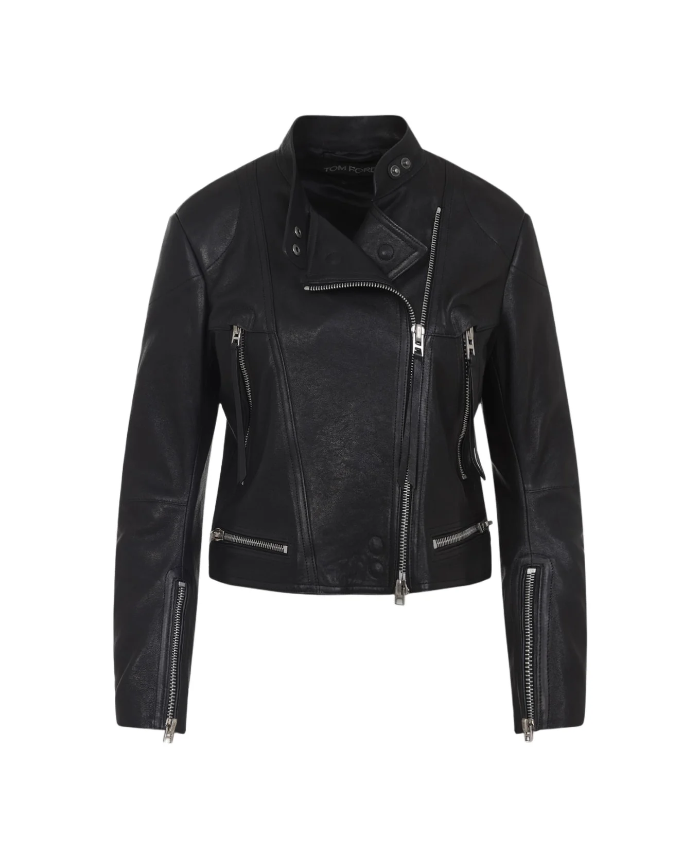 Tomf Ford Black Lamb Leather Jacket. Pure black lamb leather jacket, stand-up collar, side buttoned fastening, side zipped fastening, chest zipped pockets, side zipped pockets, long sleeves, zipped cuffs, straight hem, biker design, fully lining. Made in: Italy Color: Black Model number: CSL788LEX402LB999