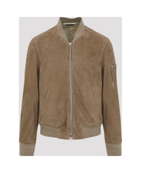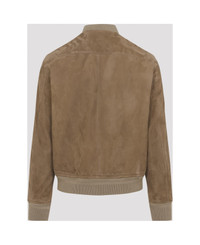 Tom Ford Beige Leather Jacket. Crafted from dark beige suede leather, it features a bomber-style design, a round neckline, a two-way zip fastening, two front pockets, and long sleeves with a small zip pocket on the left sleeve. Finished with ribbed edges and a full lining. Made in: Italy Color: Jbv Military Sand Model number: LBS087LMS027JBV