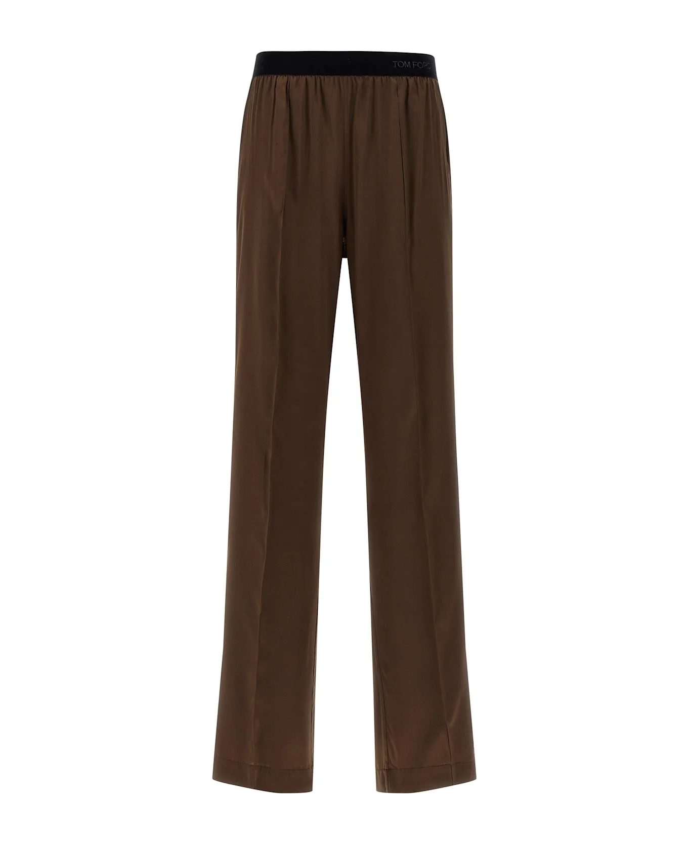 Stretch silk satin pants with pajama style, contrast velvet logo elastic band at the waist, pockets, straight leg, medium waist. Composition: 94% silk 6% elastane Made in: Italy Color: Brown Size and fit: - true to size fit Model number: PAW683FAX881ECD