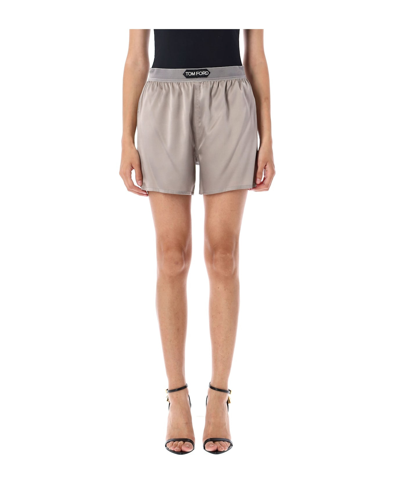 Silk Satin Boxer Shorts By Tom Ford. Featuring: Velvet Elasticated Waistband Centre Front Signature Tom Ford Jacquard Logo Label On Waistband Relaxed Fit Model Is 1,72 M And Wears Size S Composition: 94% silk, 6% elastane Made in: Italy Color: SILVER Model number: SH0021FAX881IG606