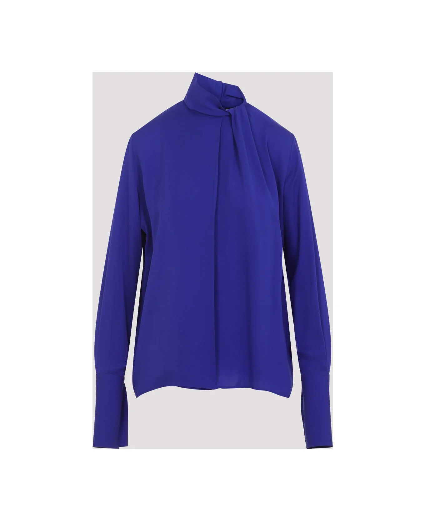 Tom Ford Blue Silk Shirt. Crafted from blue silk georgette, draped collar, front pleat detail, cut-out on the front and back, concealed hook fastening on the back, long sleeves with buttoned cuffs. Made in: Italy Color: Clemetis Blue Model number: CA3319FAX1507HB705