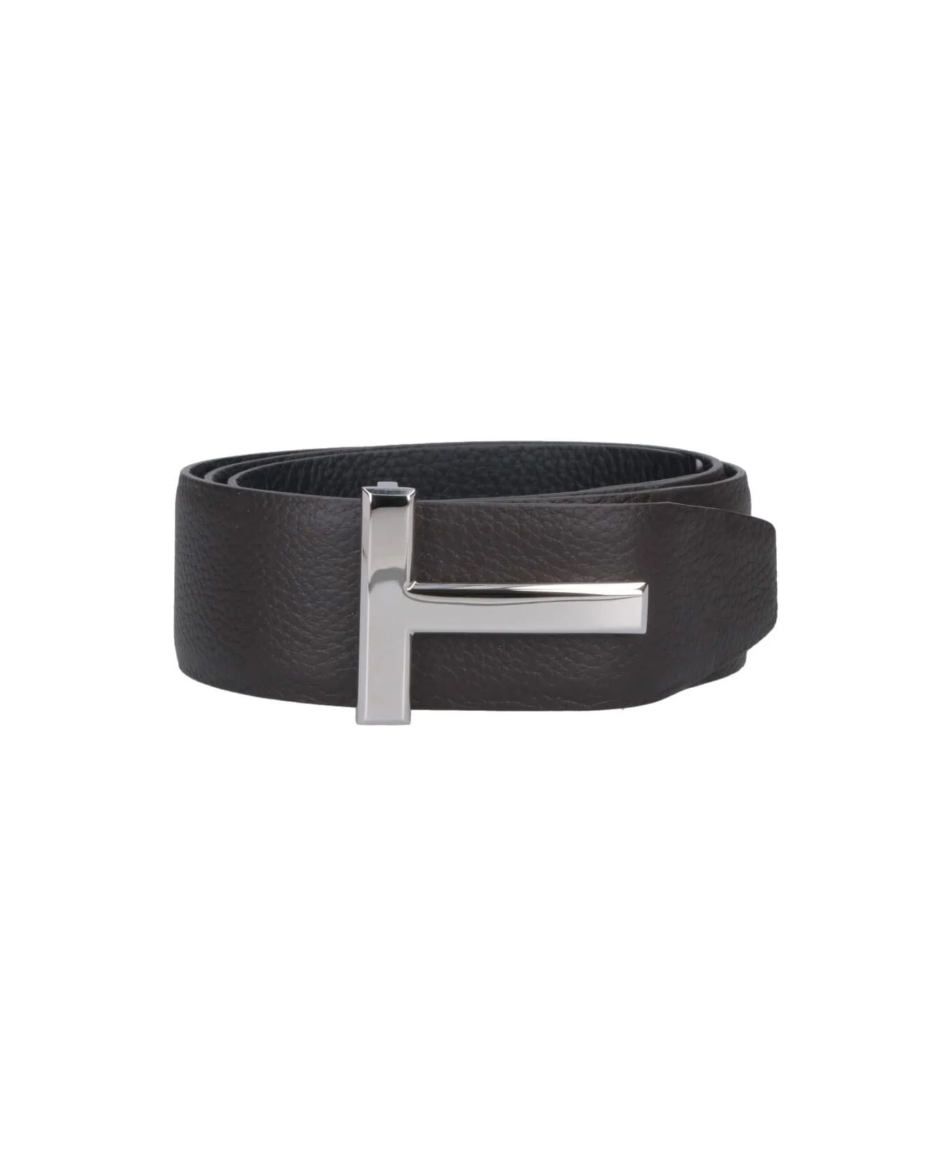 Tom Ford 't icon' dark brown hammered leather belt with silver metal 'T' logo buckle detail at the front, adjustable. Composition: 100% Calf Leather Made in: Italy Color: Brown Size and fit: - altezza: 4 cm Model number: TB178LCL236SENB