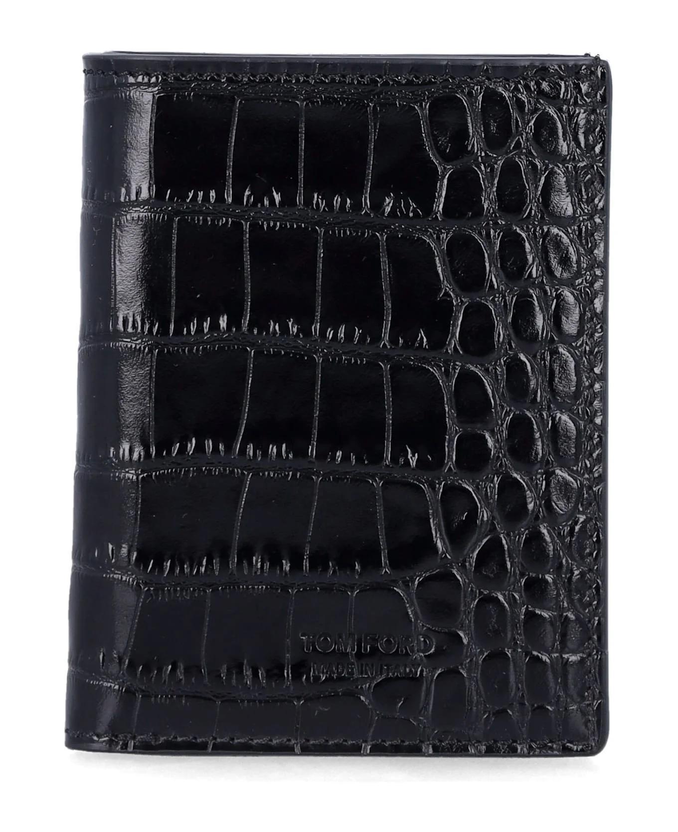 Crafted From Fine Calf Leather With A Striking Crocodile-embossed Finish, This Tom Ford Wallet Combines Refined Aesthetics With Everyday Functionality. The Compact Design Opens To 6 Card Slots, A Note Compartment And A Smooth Leather Lining, Finished With The Embossed Tom Ford Logo. A Statement Piece Of Italian Craftsmanship For Those Who Value Elegance And Practicality. Croc-embossed Calf Leather Six Interior Card Slots One Note Compartment Smooth Leather Interior Tom Ford Logo Embossed Inside Height: 10 Cm Width: 7,7 Cm Composition: Upper, 100% calf leather Lining, 100% sheep leather Made in: Italy Color: BLACK Size and fit: - Height: 10 cm Width: 7,7 cm Model number: Y0417LCL439GNAA