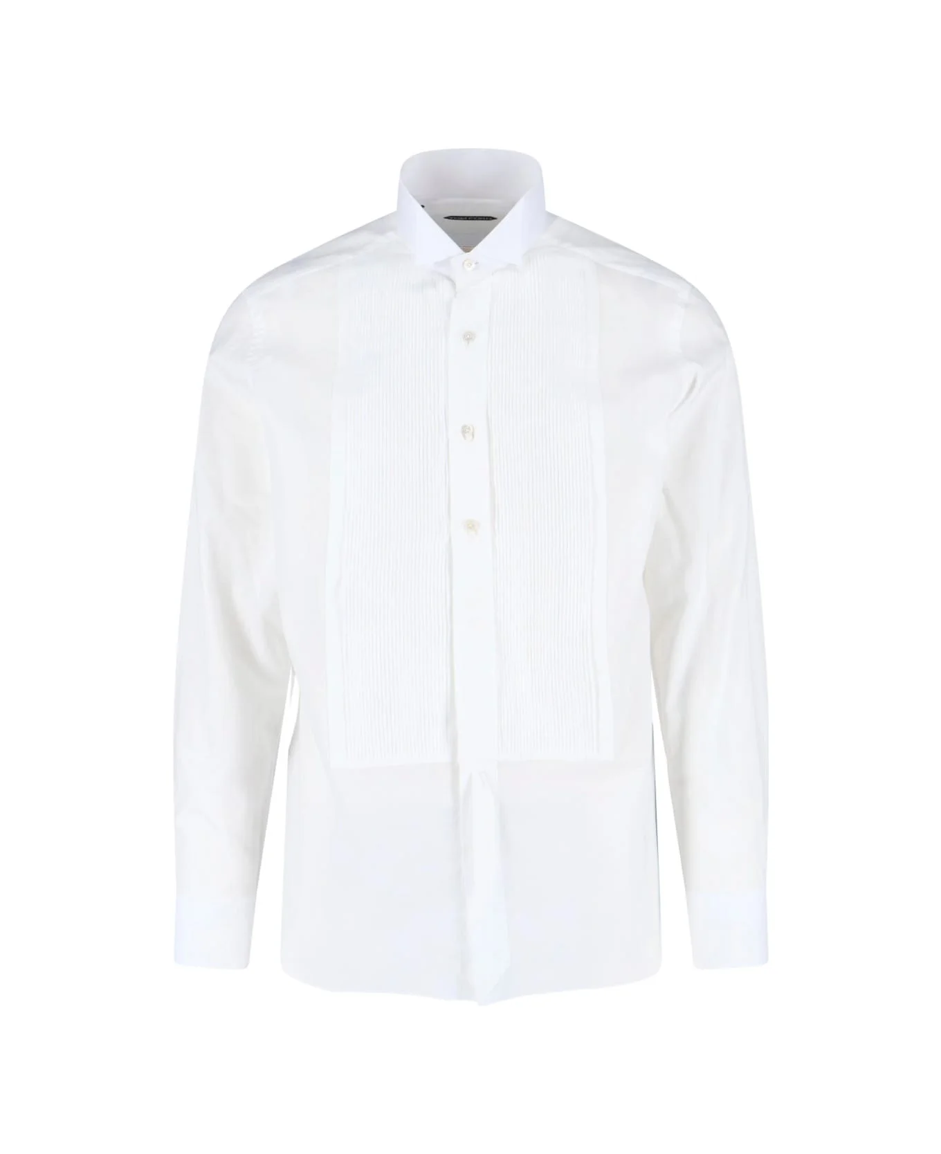 Tom Ford white cotton tuxedo shirt with classic collar, front button closure, long sleeves, pleated detail on the front, button cuffs, curved hem. Composition: 100% Cotton Made in: Italy Color: White Size and fit: - vestibilita regolare Model number: HFCL02CGS01WAA