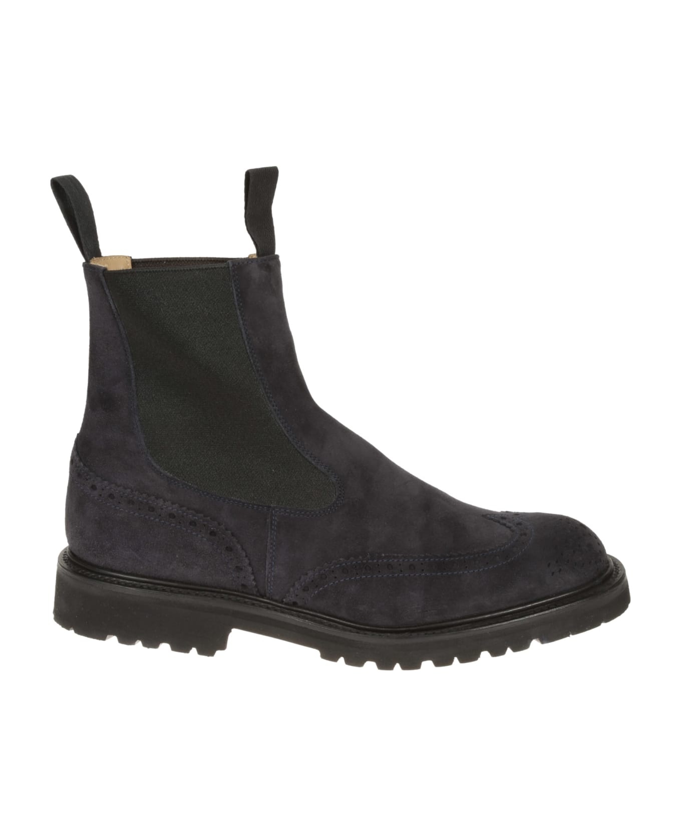 "TRICKERS Chelsea ankle boot in suede with swallow tail, technical fabric elastic, lightweight Vibram rubber sole. " Composition: 100% Leather Made in: United Kingdom Color: Navy Castorino Model number: 275438NAVY