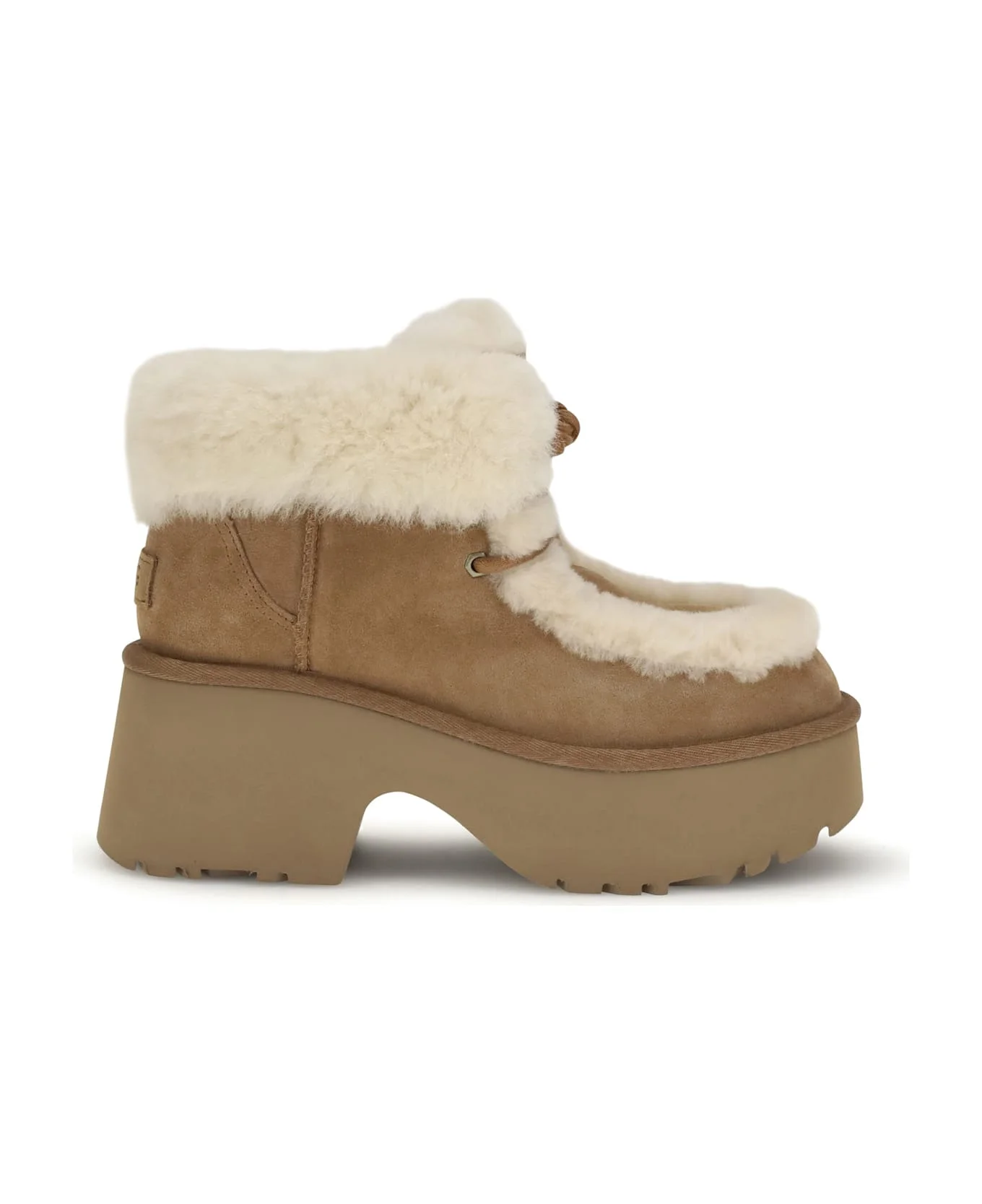 The classic esmee ankle boots by ugg combine comfort and style with a cozy, modern design. crafted with a suede upper, they feature exposed shearling stitching and a turn-up cuff for a versatile, warm look. cotton laces add a casual touch, while the sugarcane-derived eva sole ensures lightweight and sustainability. a fabric trim with recycled polyester fibers and a hot-embossed ugg logo complete the style for an authentic and recognizable touch. Composition: 100% % Leather, 100% % Rubber Made in: China Color: Beige Size and fit: - 7 cm Model number: 1171532CHE
