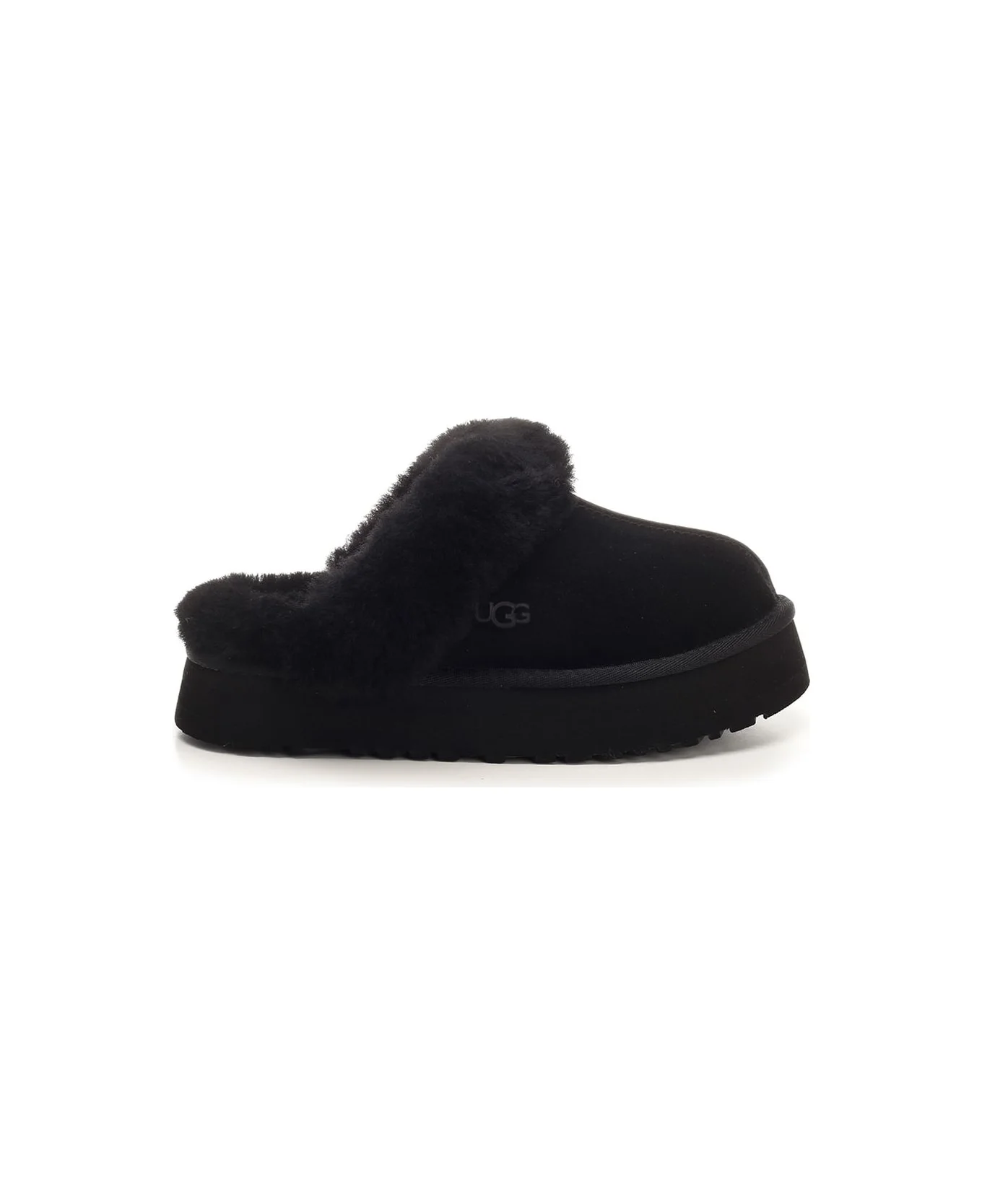 UGG 'Disquette' slipper made of sheepskin and suede, with a 2. 5 cm platform and heat-embossed UGG® logo. Composition: 80% Leather, 20% Other Made in: Vietnam Color: Black Size and fit: - 3,5 Model number: 1122550BLK