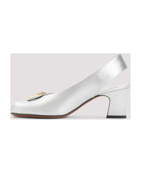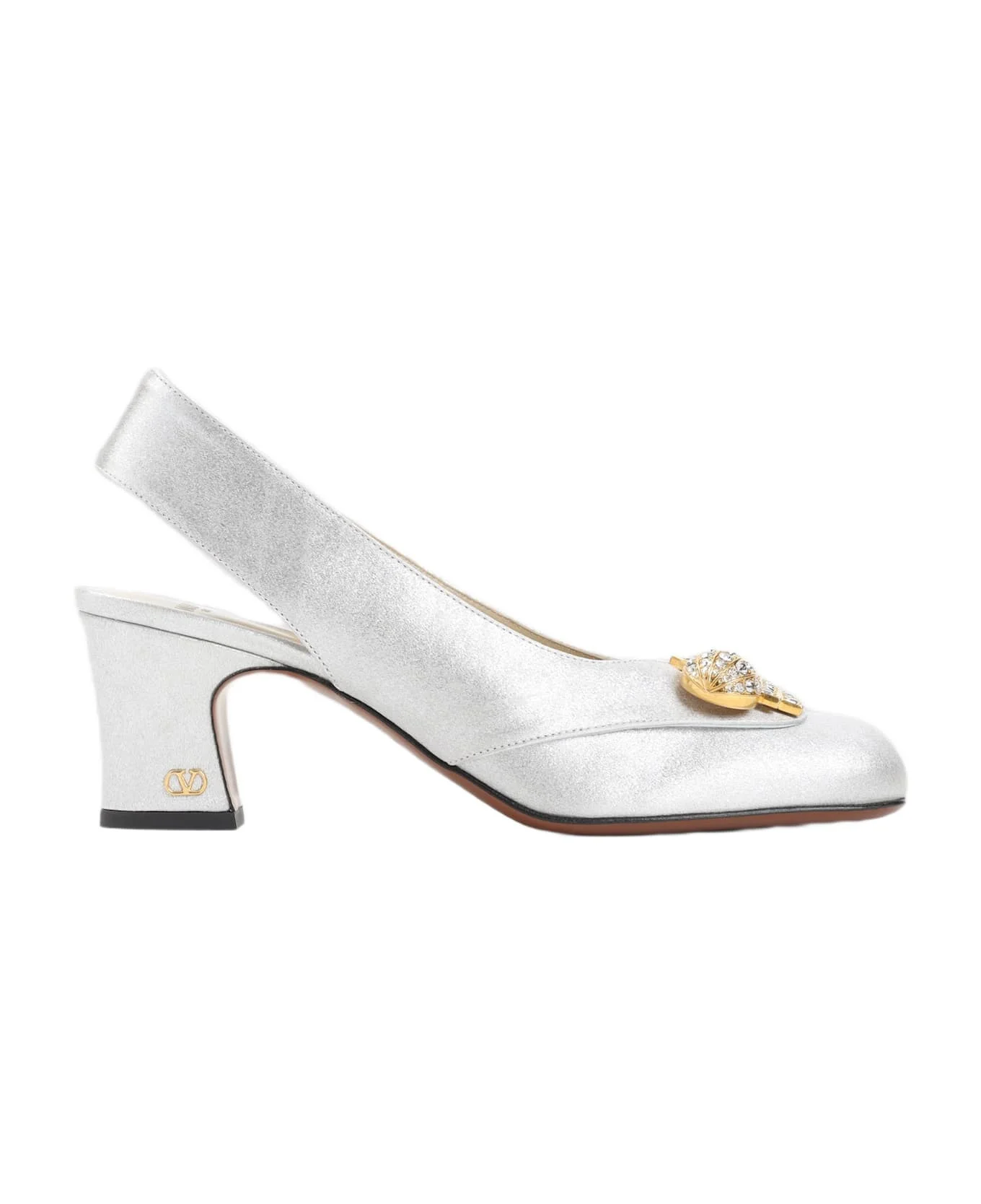 Valentino Garavani Silver Leather Adamantine T. 60 Slingback. Pure silver leather pumps, squared toe, top gold-tone metallic shell with crystal details, sling back design, wide heels, side gold-tone metallic signature V logo. Made in: Italy Color: Silver Size and fit: - Heel Hight: 6cm Model number: 7W2S0MJ8PHIS13